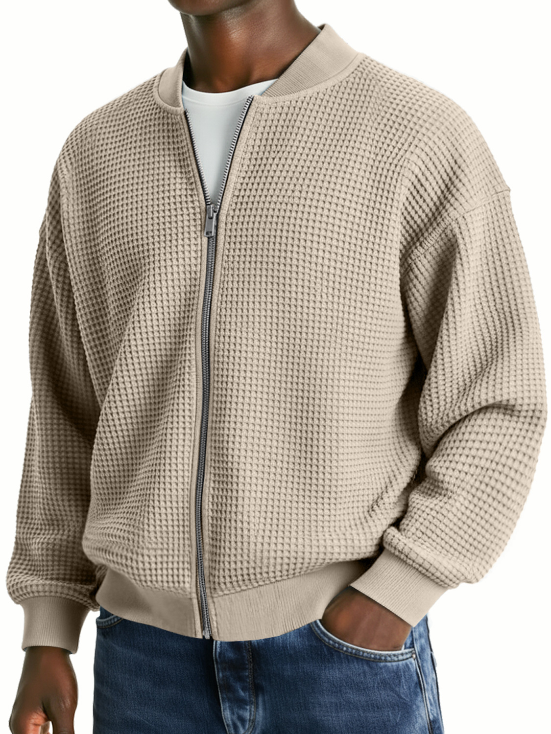 Men's Waffle Knit Casual Loose Zip-up Jacket$45.99 USD -