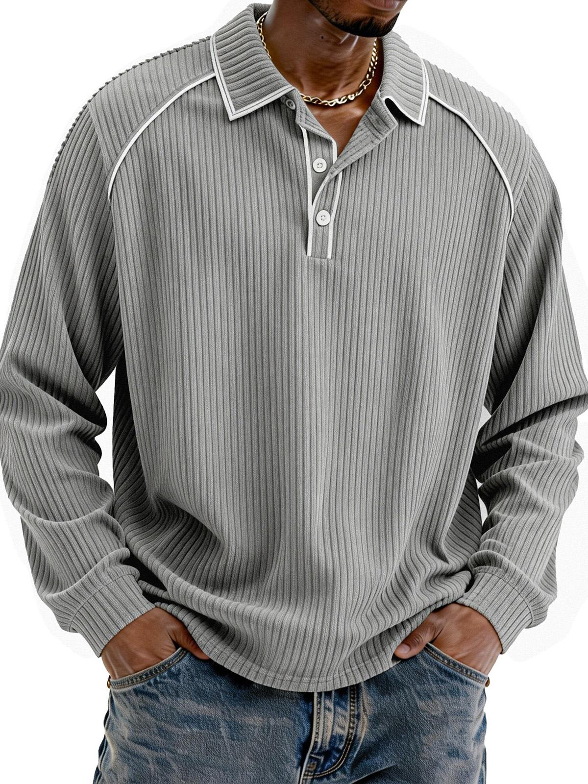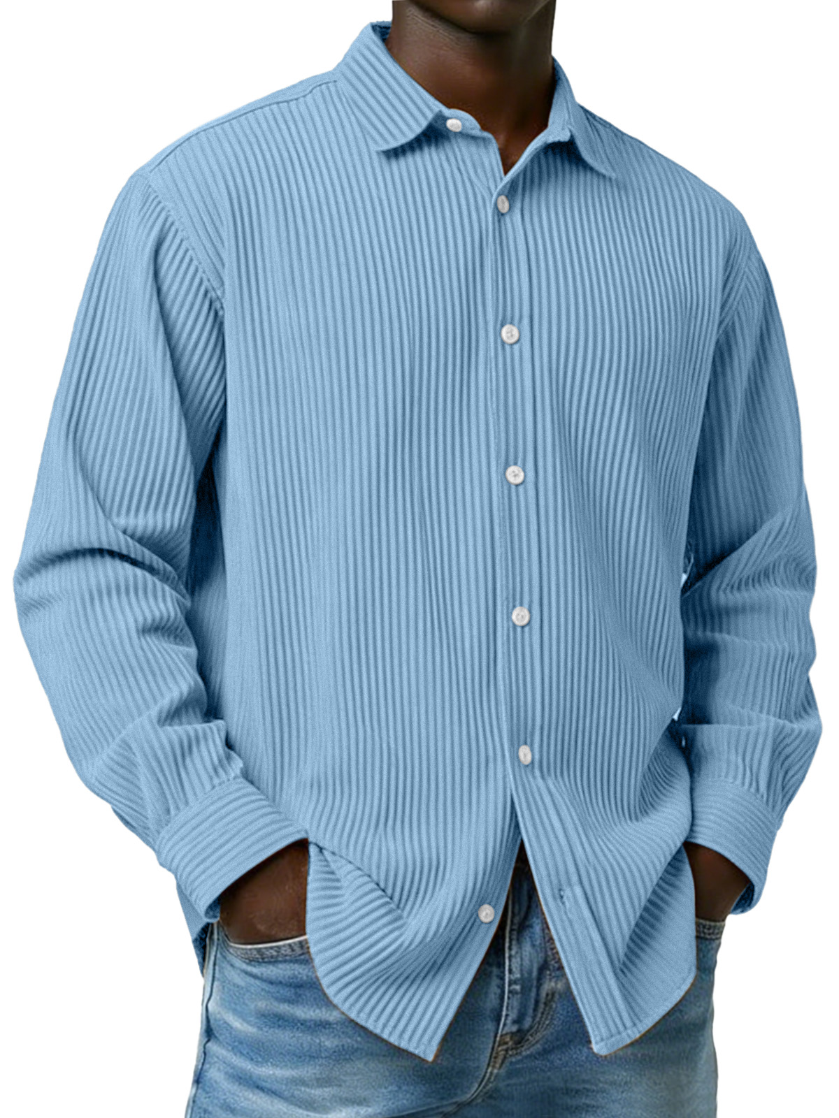 Men's Simple Solid Color Ribbed Long-sleeved Collared Shirt$42.99 USD -