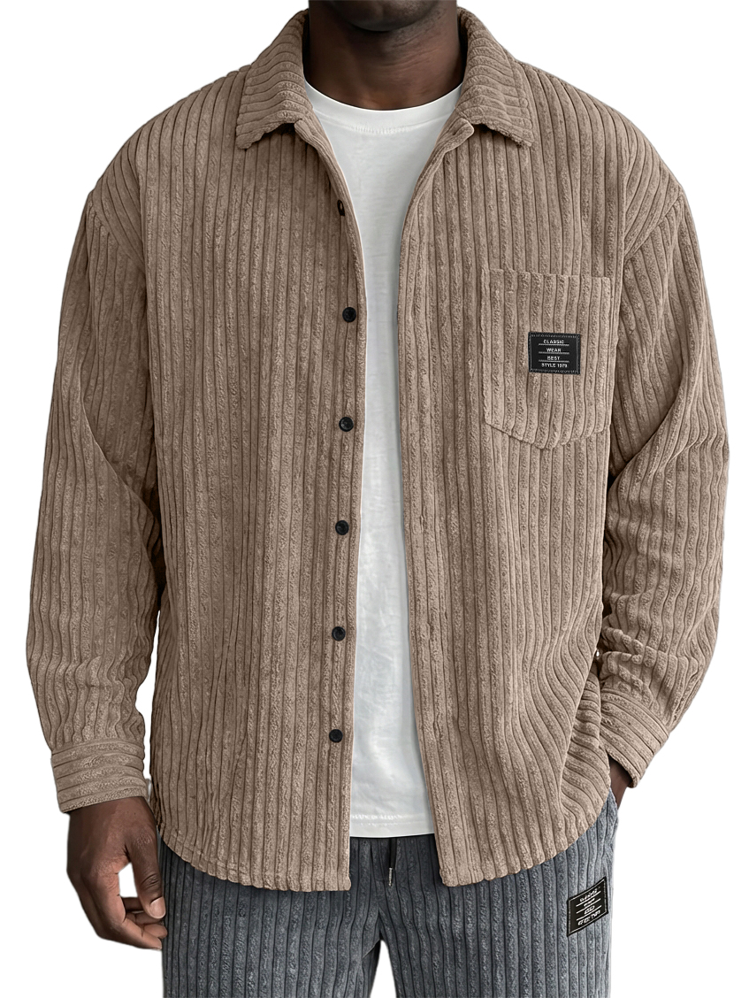 Men's Vintage Corduroy Textured Comfortable Loose Striped Simple Embroidered Label Long-Sleeve Shirt$42.99 USD -