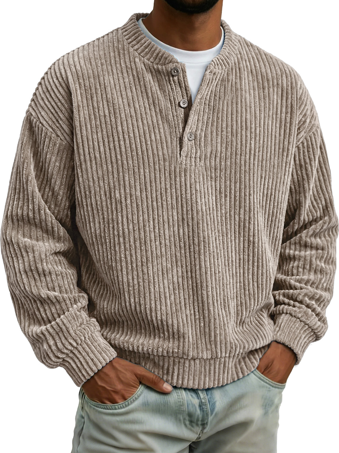 Men's Vintage Corduroy Solid Color Long-sleeved Henley Shirt$42.99 USD -