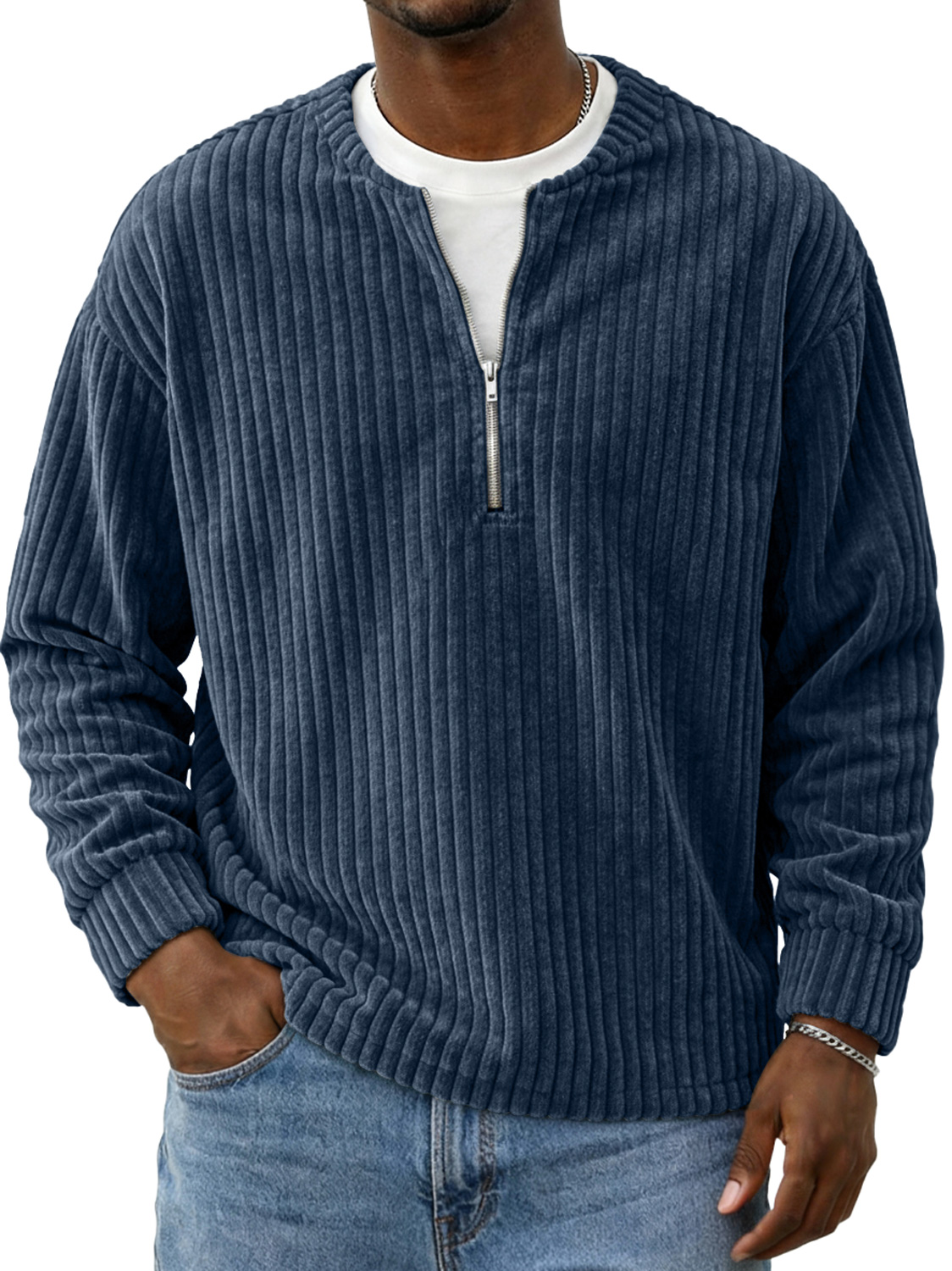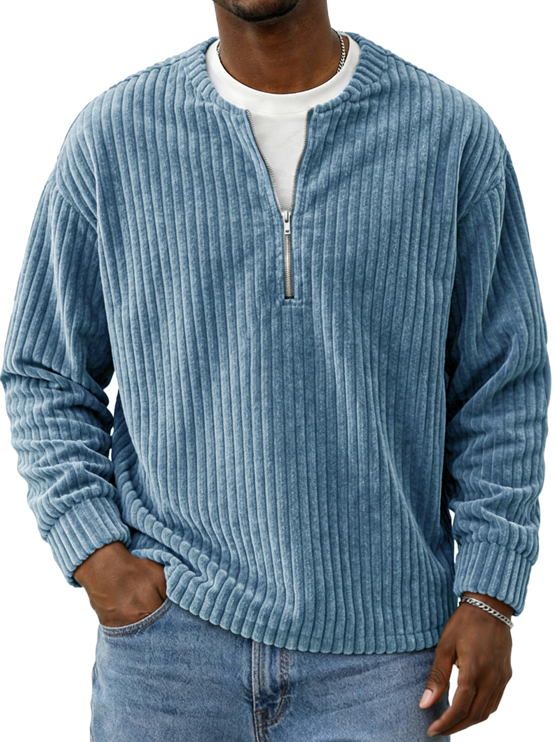 Men's Vintage Corduroy Crew Neck Zip-up Casual Long-sleeved T-shirt$42.99 USD -