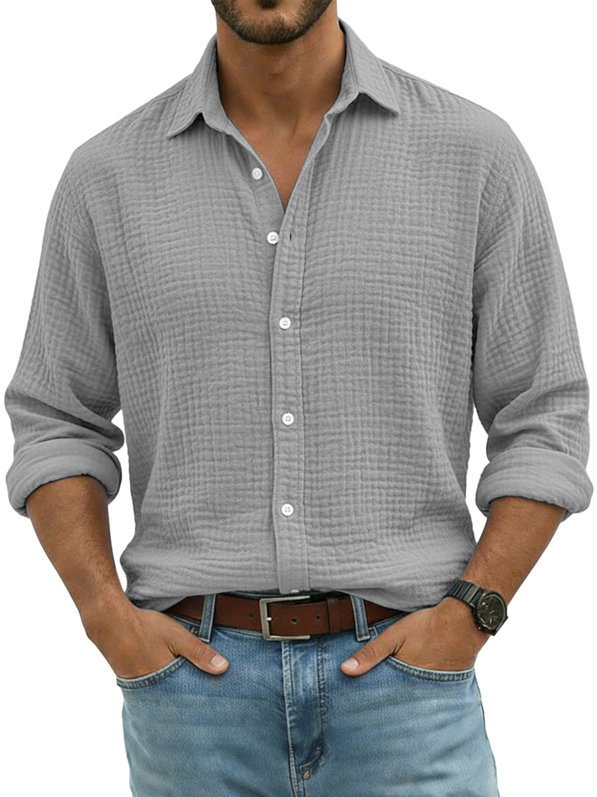 Men's Comfortable Solid Color Crinkled Breathable Long-sleeved Shirt$42.99 USD -