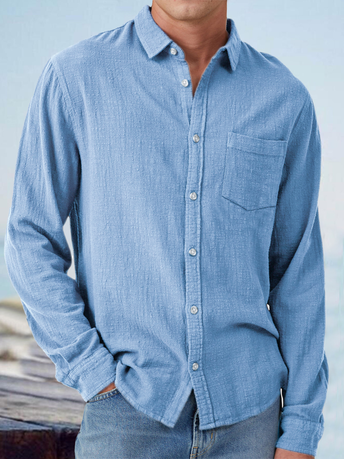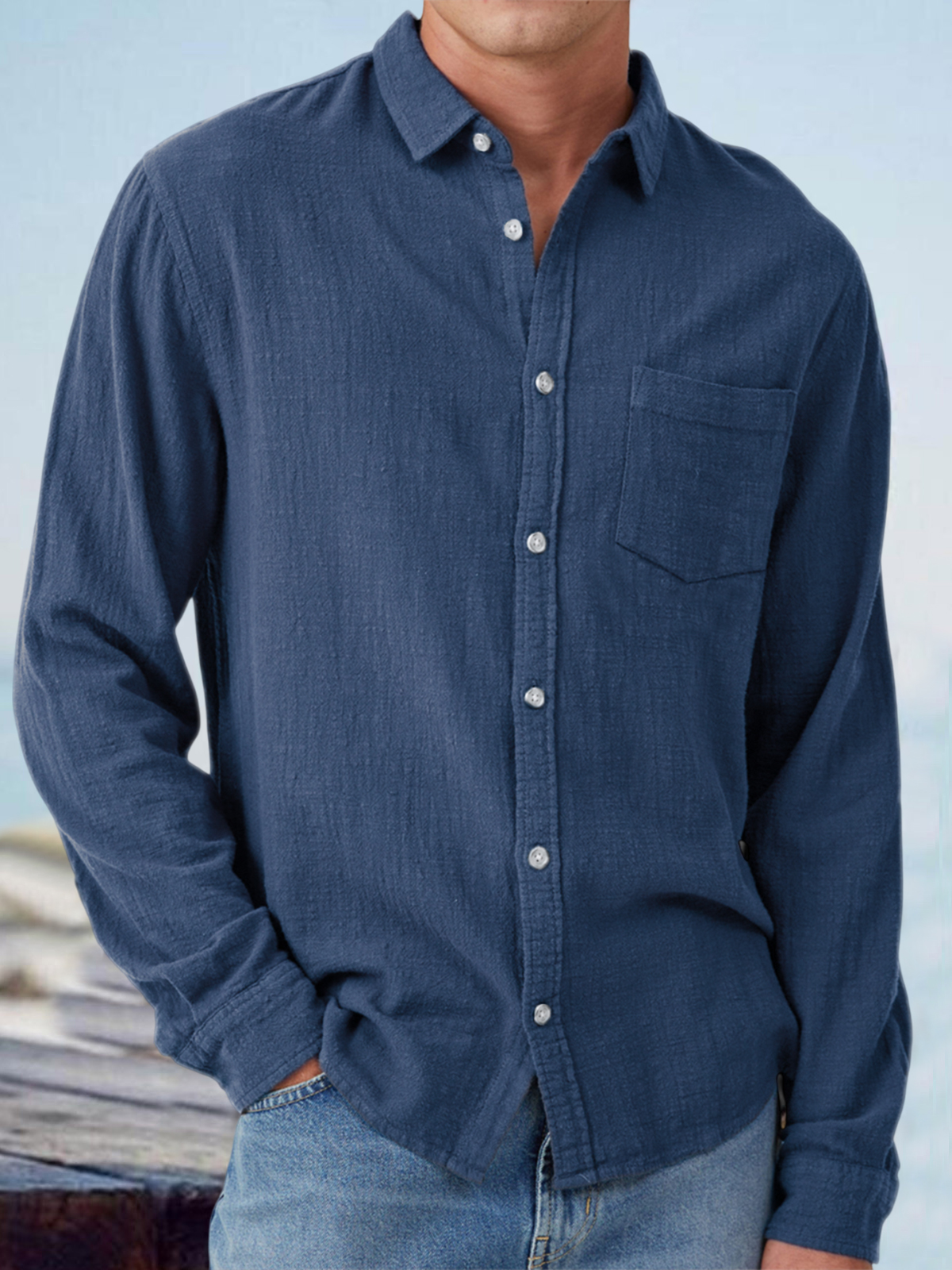 Men's Casual Solid Color Breathable Cotton Pleated Comfortable Lapel Long-sleeved Shirt$42.99 USD -