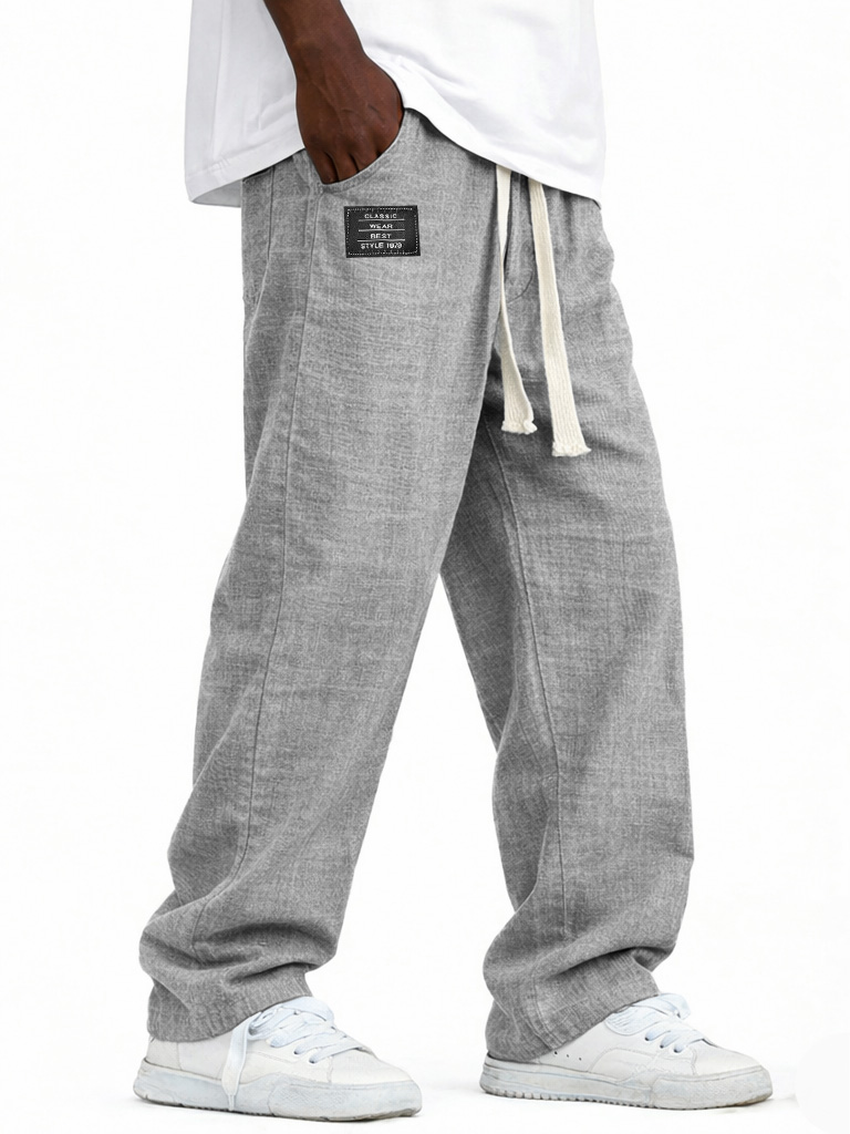 Men's Fashionable Casual Linen Pants with Elastic Waist, Embroidered Logo Pockets$42.99 USD -