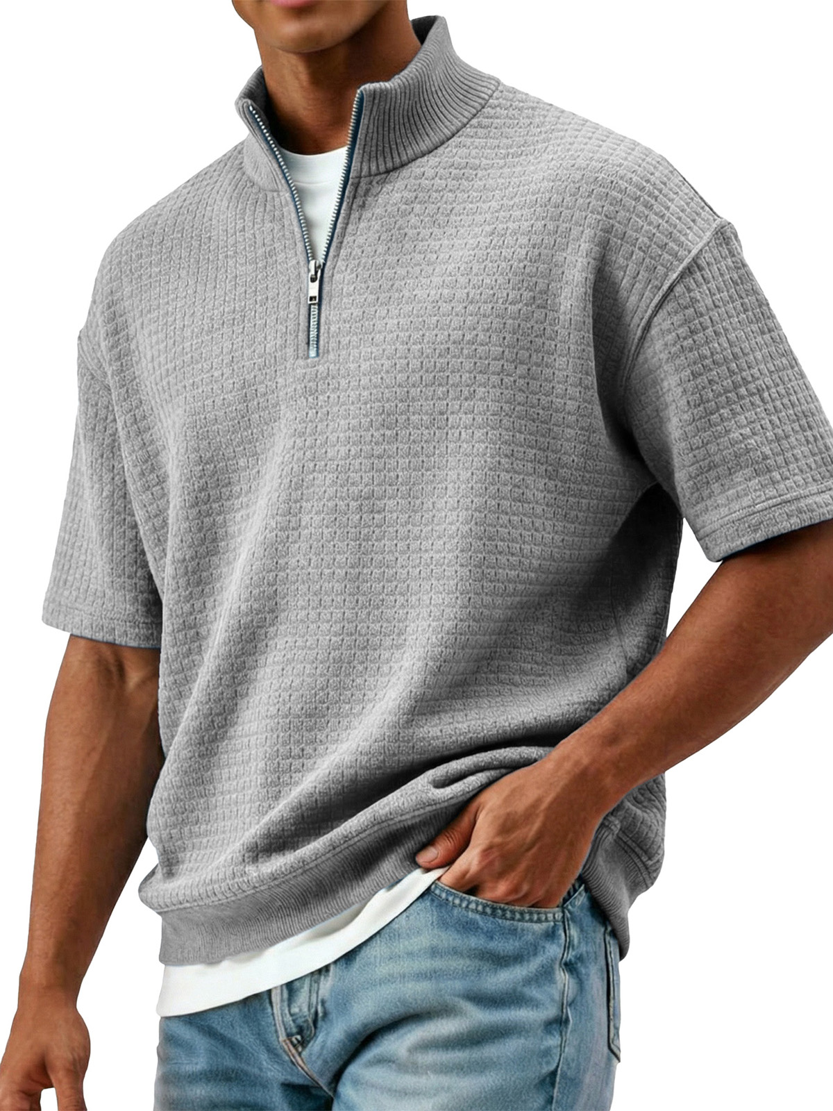 Men's Fashionable Casual Waffle Knit Collar Short-Sleeve Polo Shirt$38.99 USD -
