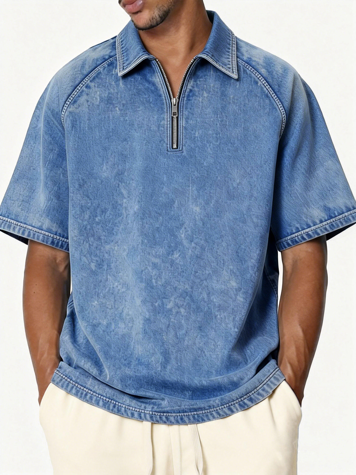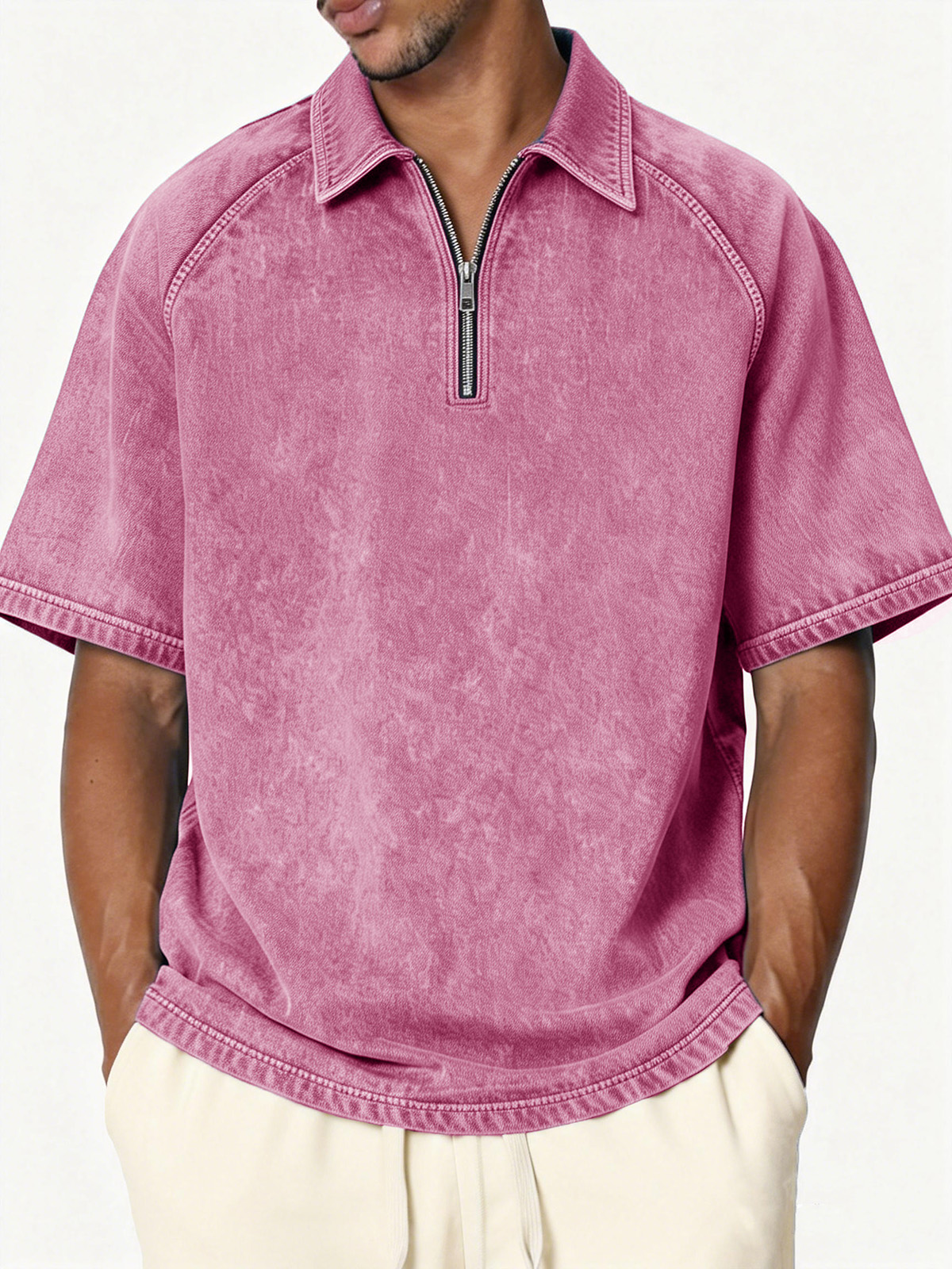 Men's Retro Distressed Raglan Collar Zipper Loose Short-Sleeve Polo Shirt$38.99 USD -