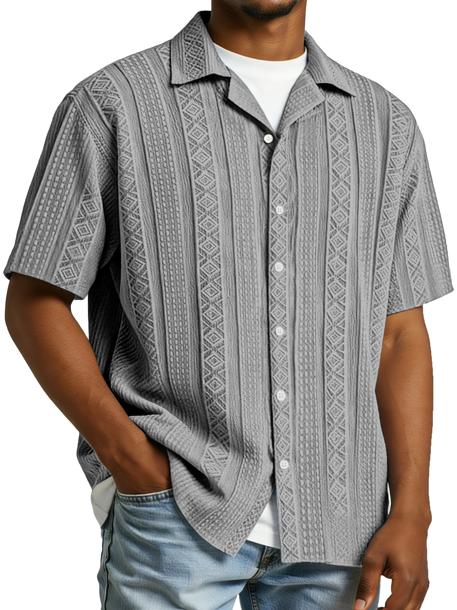 Men's Casual Solid Color Pleated Texture Short-sleeved Button Polo Shirt$39.99 USD -