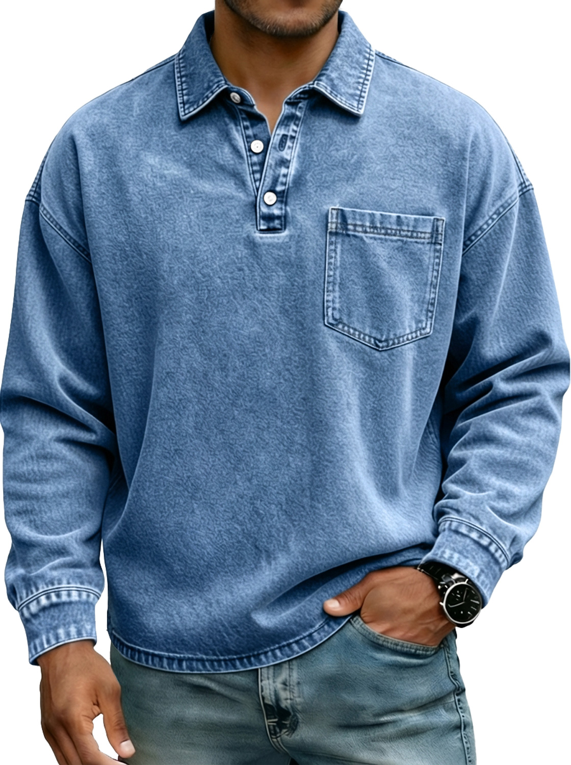 Men's Fashionable Retro Distressed Collared Pocket Long-Sleeved Polo Shirt$45.99 USD -