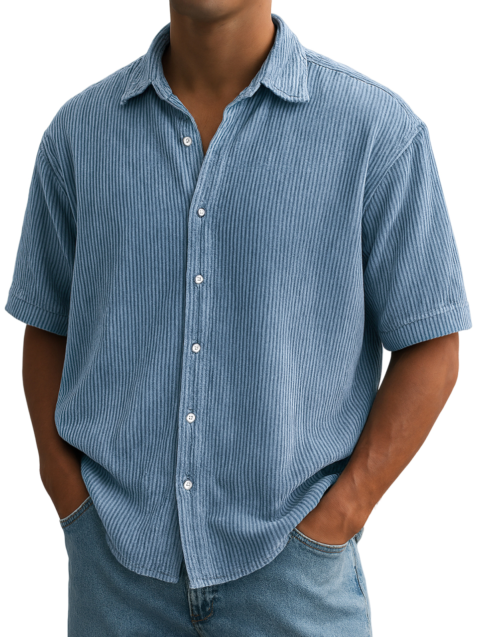 Men's Stylish Ripped Vertical Striped Corduroy Comfortable Casual Short Sleeve Shirt$39.99 USD -