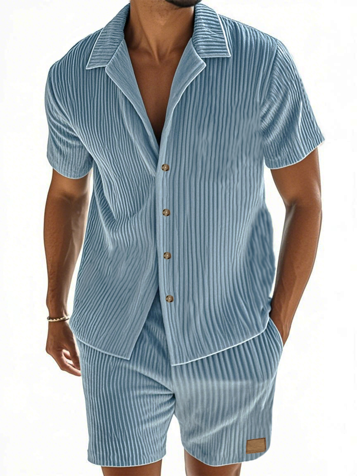 Men's Vertical Striped Texture Casual Short-sleeved Shirt and Shorts Two-piece Suit$69.99 USD -