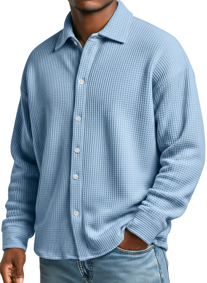 Men's Lapel Waffle Knit Casual Solid Color Long-sleeved Shirt$43.99 USD -