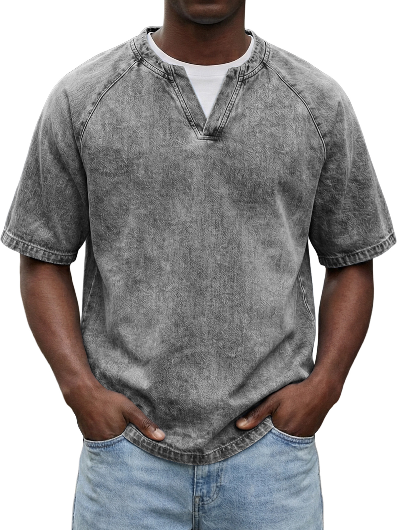 Men's fashionable waffle-knit raglan sleeve V-neck short-sleeved T-shirt$38.99 USD -