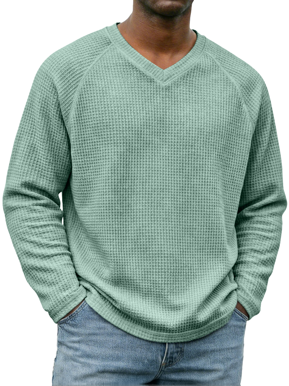 Men's Simple V-neck Raglan Sleeve Waffle Knit Casual Long-sleeved T-shirt$42.99 USD -