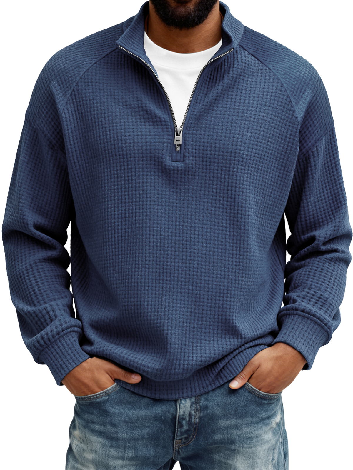 Men's Retro Casual Waffle Fabric Raglan Sleeve Quarter-Zip Long-Sleeve T-Shirt$43.99 USD -