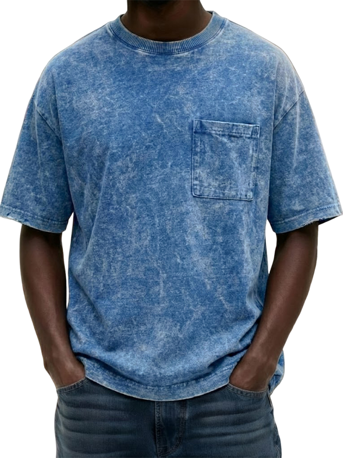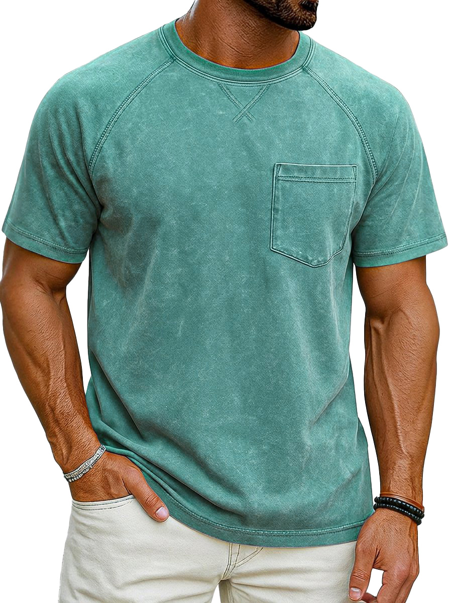 Men's Heavyweight Pure Cotton Washed Distressed Vintage Short-Sleeve T-Shirt with Chest Pocket$39.99 USD