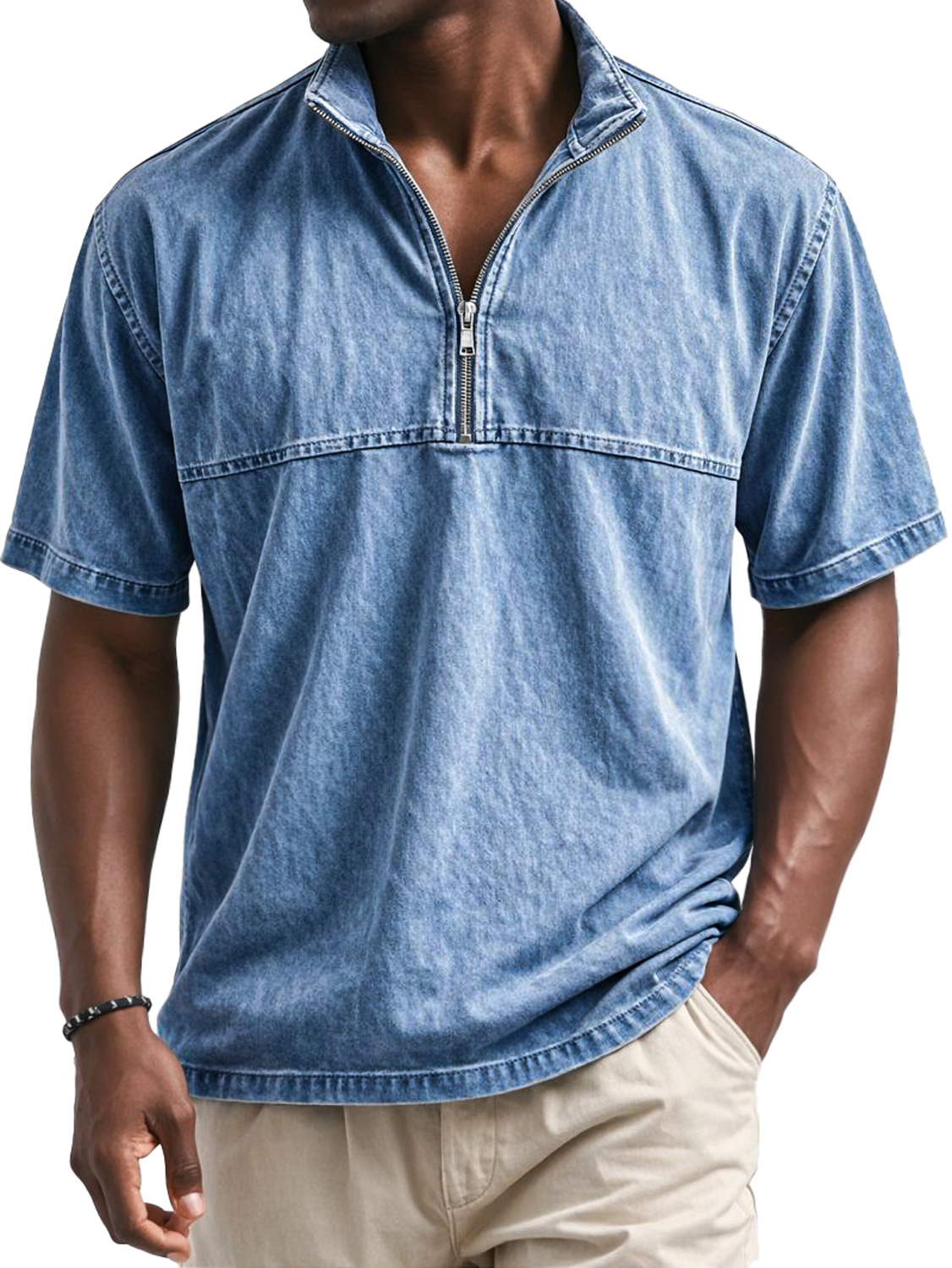 Men's Vintage Stand-collar Short-sleeved T-shirt With Zipper And Panel Design$37.99 USD -