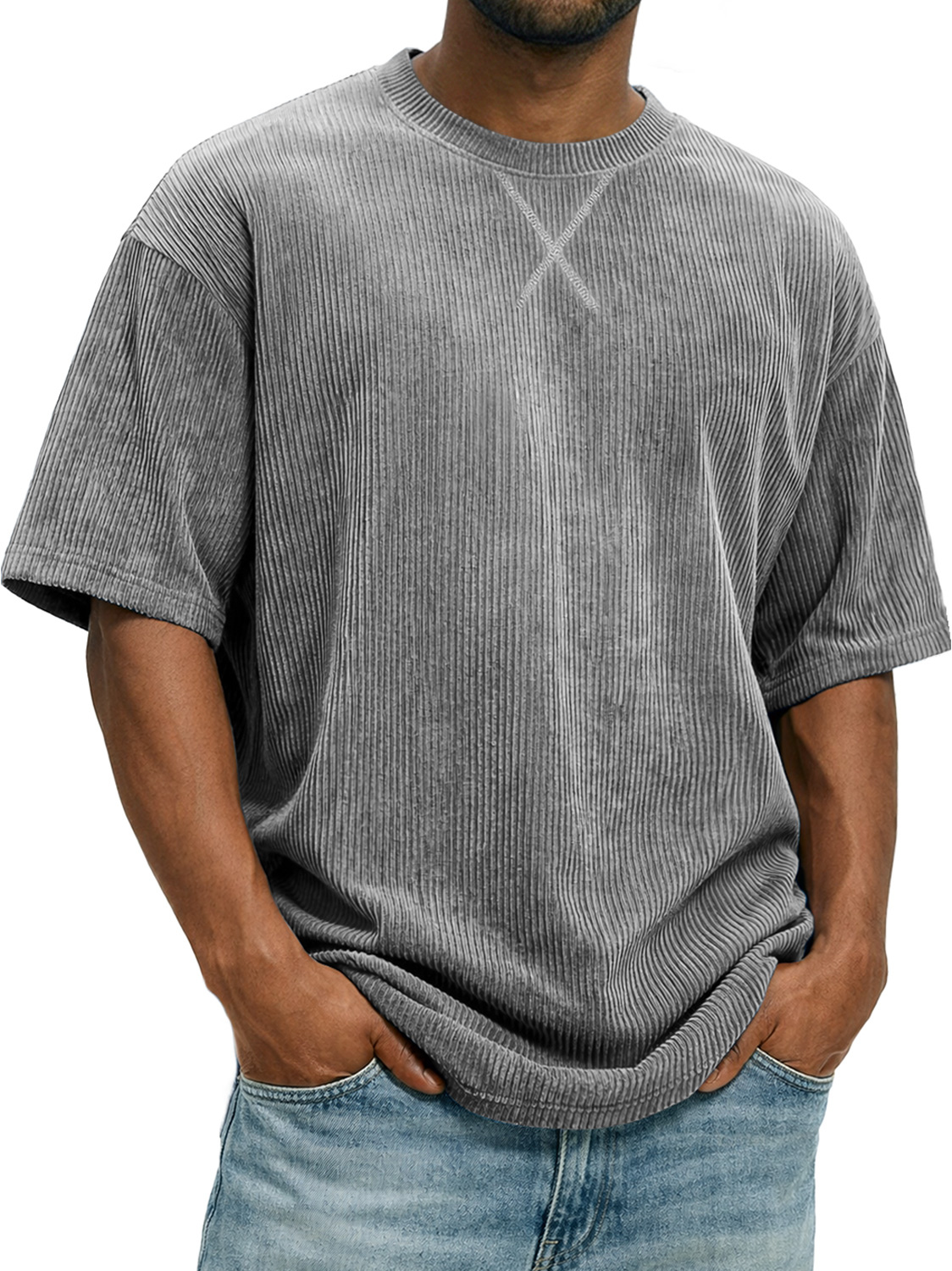 Men's Corduroy Crew Neck Short-sleeved T-shirt With A Crossover Design$37.99 USD -