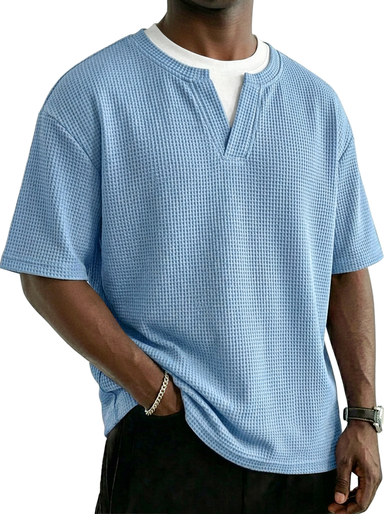 Men's Waffle-knit Faux Two-piece Casual Solid Color Short-sleeved T-shirt$37.99 USD -