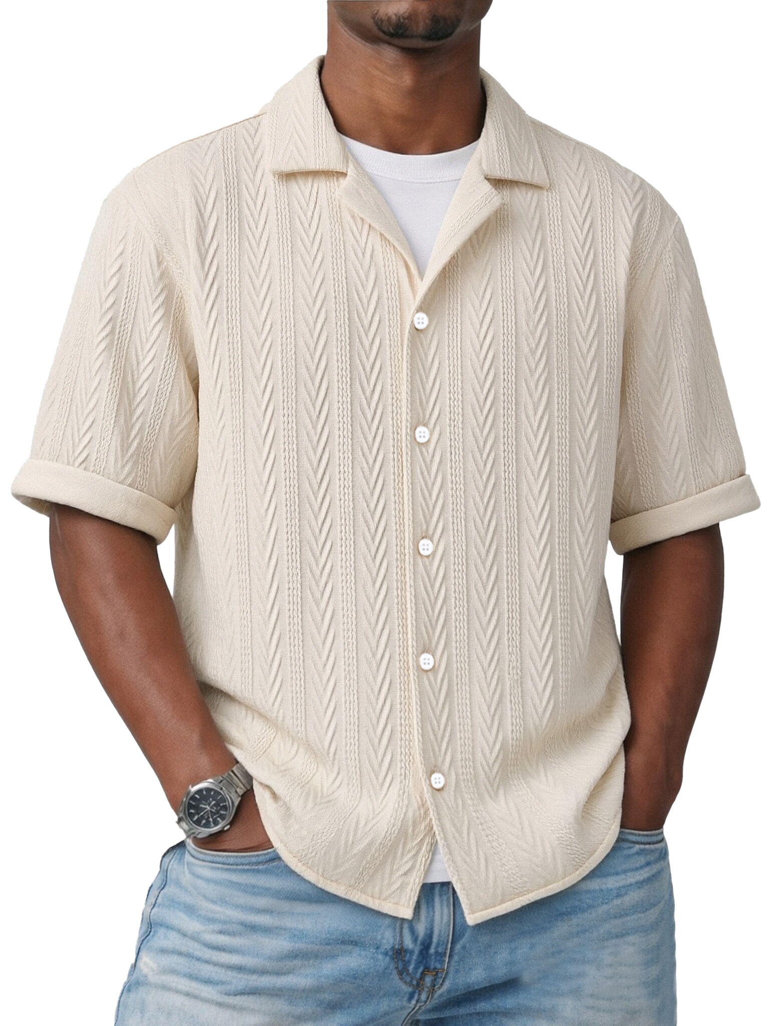 Simple Everyday Textured Short-sleeved Cuban Collar Shirt$37.99 USD -