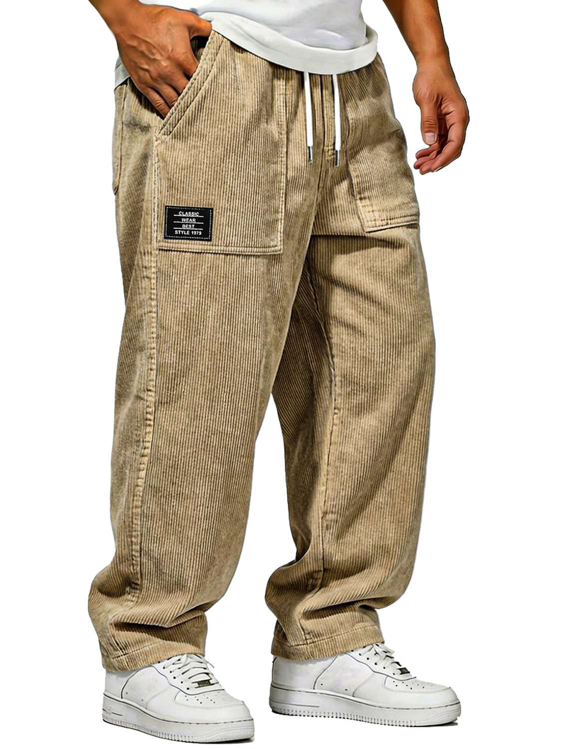 Men's Vintage Corduroy Texture Casual Drawstring Embroidered Label Trousers$39.99 USD -