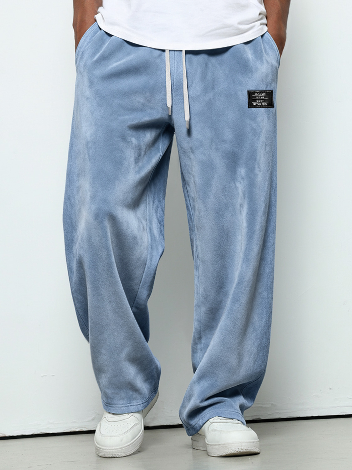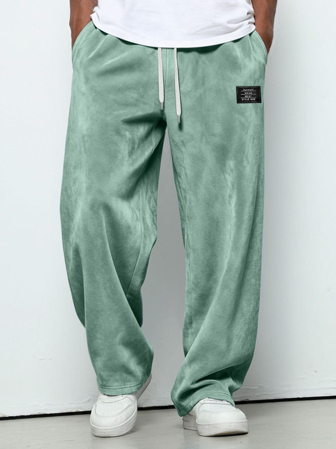 Men's Simple Suede Embroidered Logo Loose Solid Color Trousers$42.99 USD -