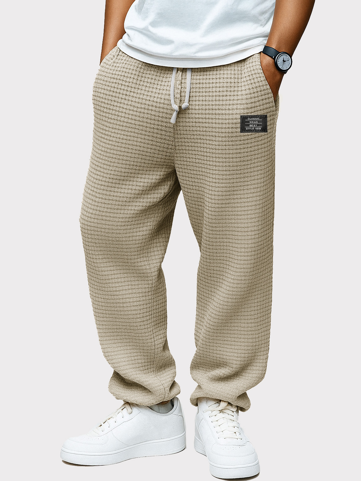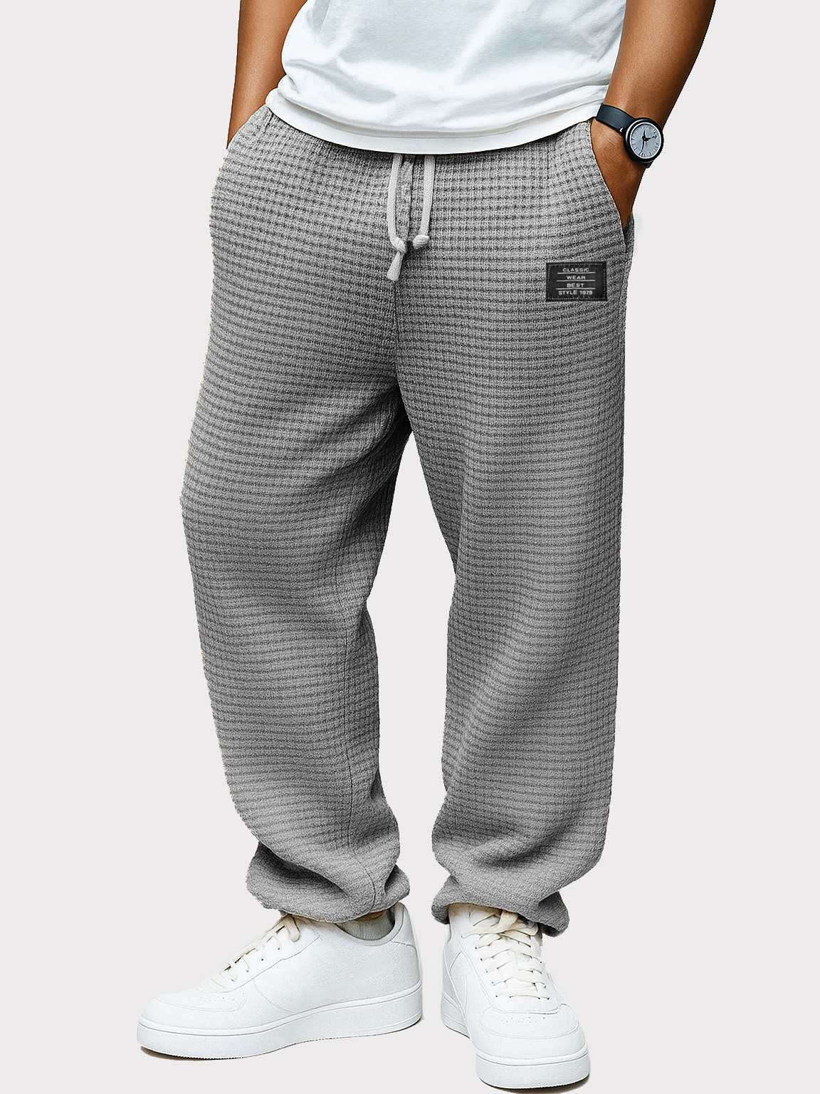 Men's Fashion Casual Waffle Fabric Pocket Pocket Embroidery Drawstring Loose Trousers$42.99 USD -