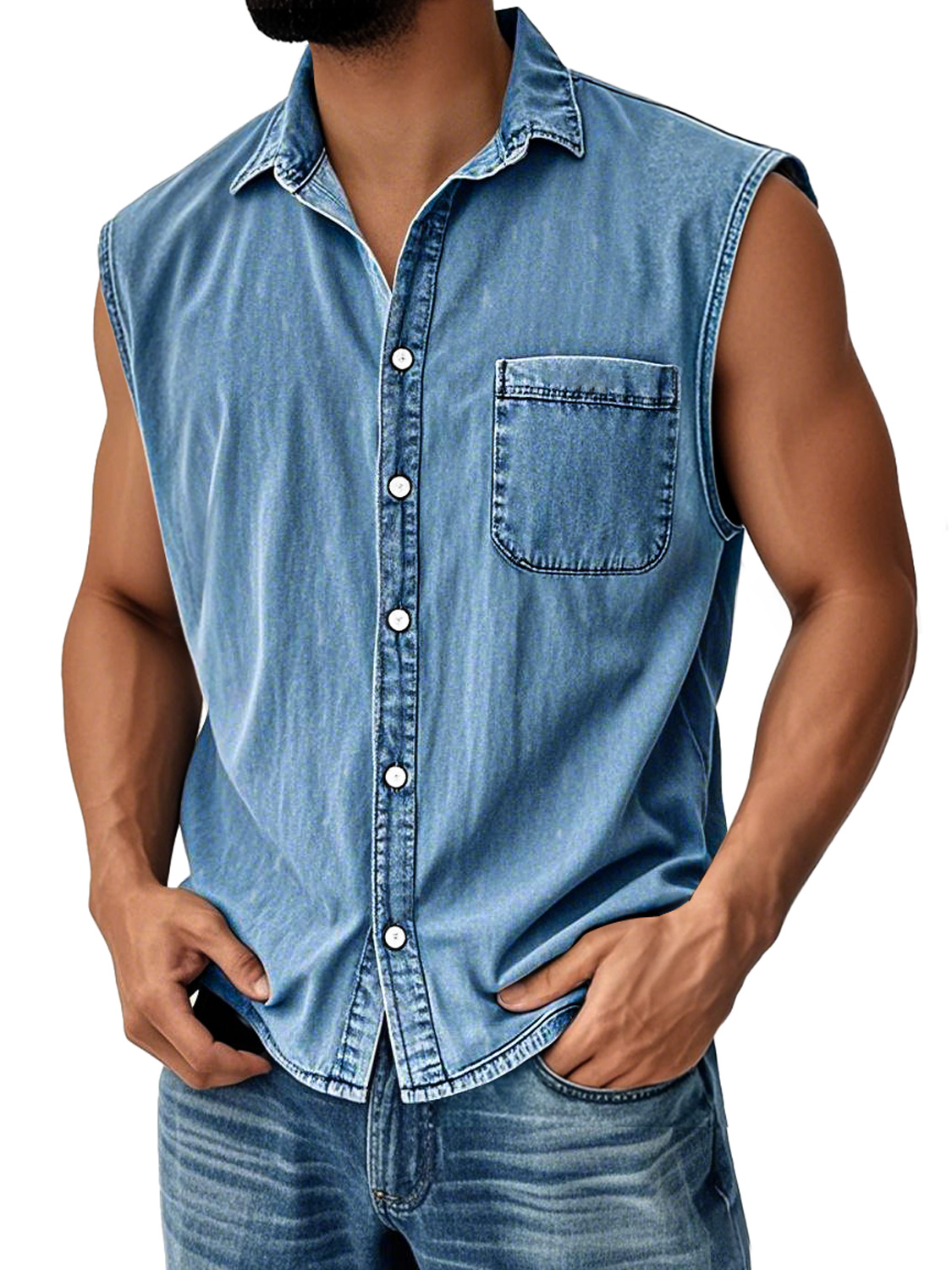 Men's Fashion Retro Distressed Pocket Lapel Sleeveless Polo Shirt$37.99 USD -