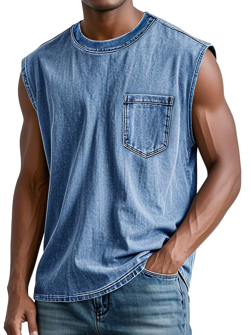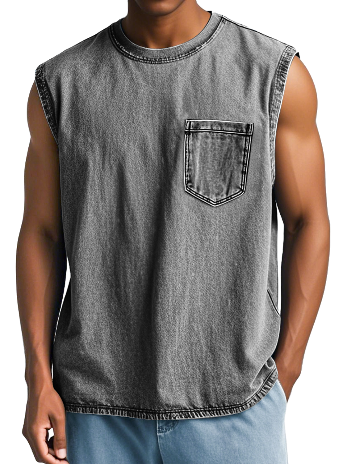 Men's Retro Washed Cotton Casual Round Neck Pocket Fashion Sleeveless Vest$37.99 USD -