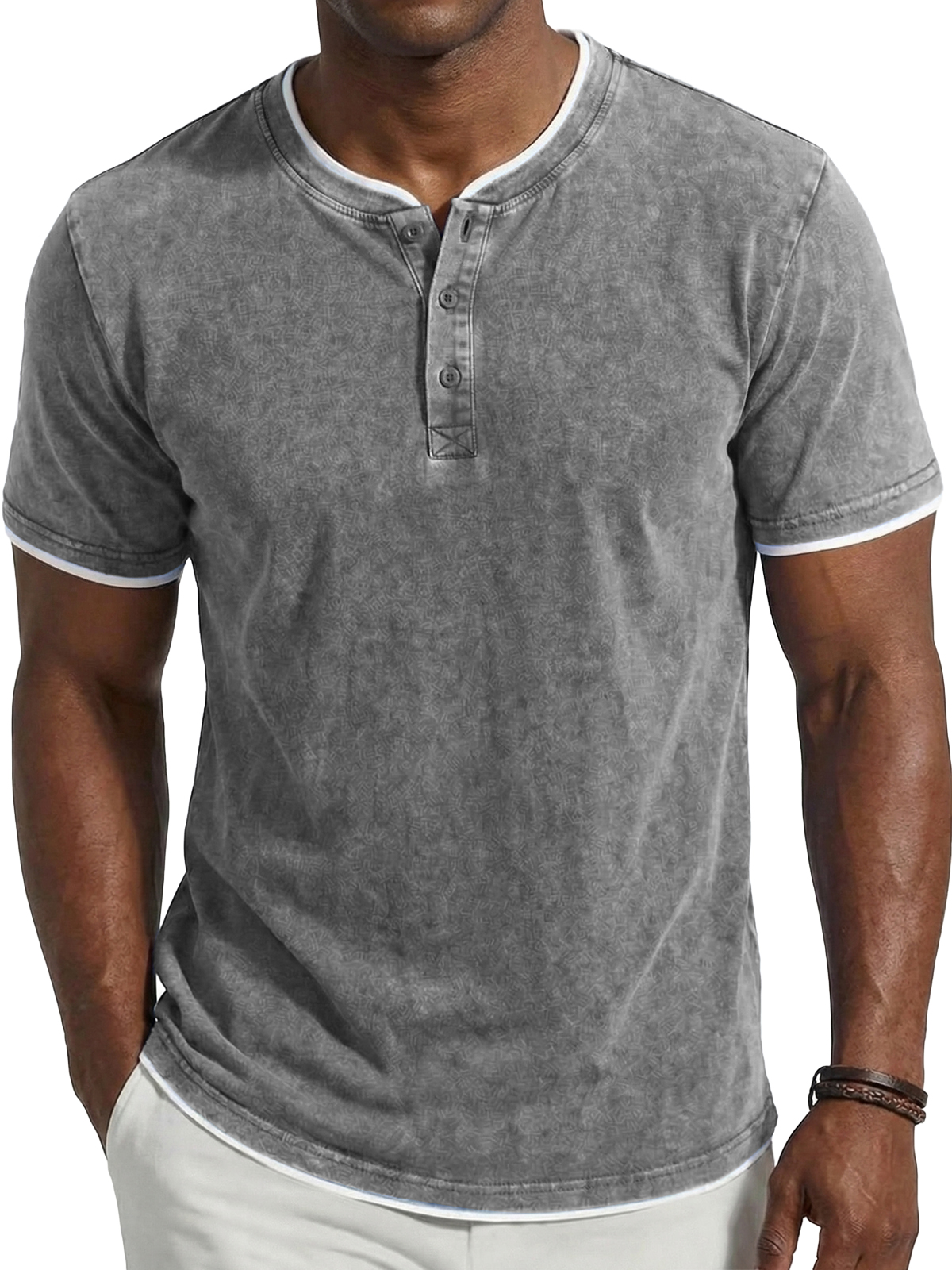 Men's Vintage Washed & Distressed Faux Layered Henley Short-Sleeve Top$37.99 USD -
