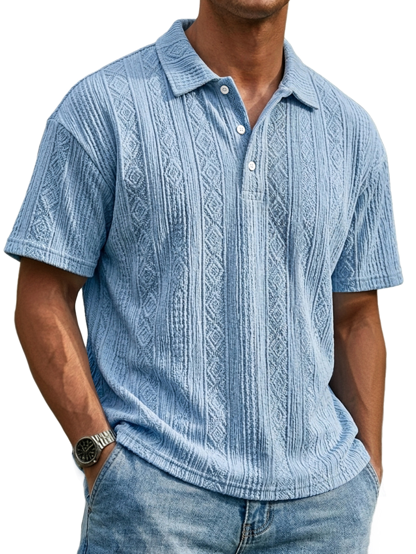 Men's Everyday Textured Collar Button-down Casual Short-sleeved Polo Shirt$37.99 USD -
