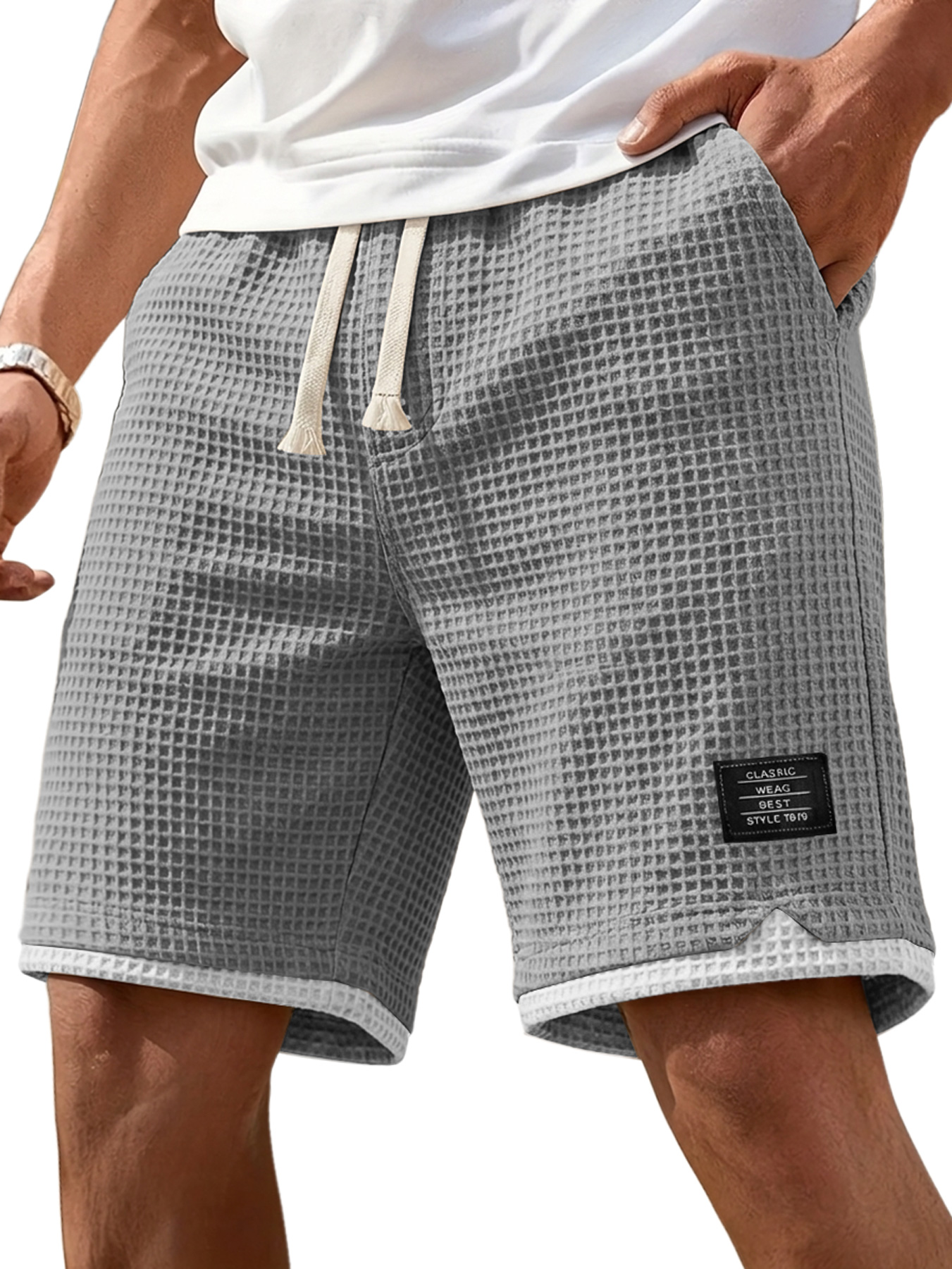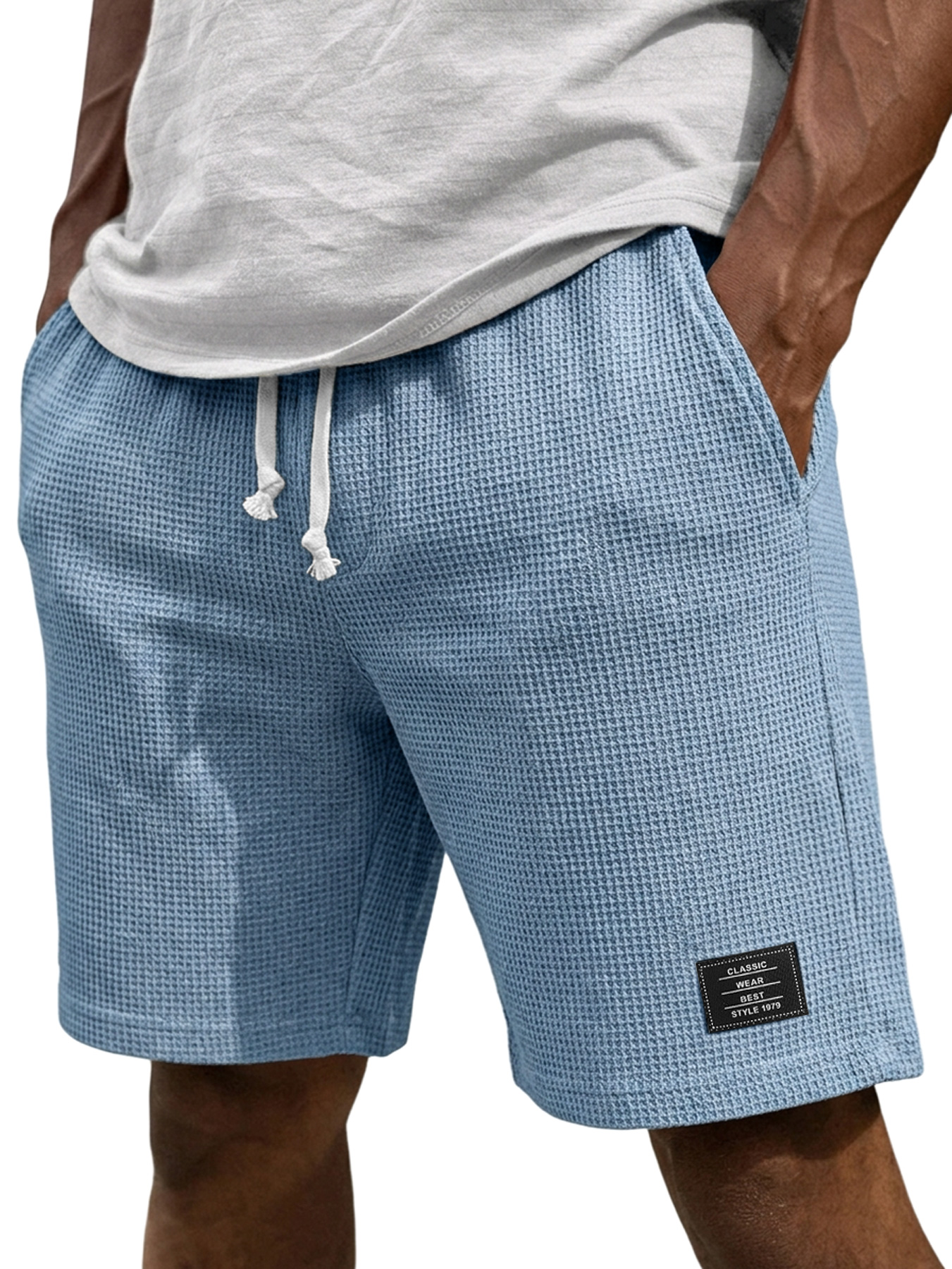 Men's Simple Waffle Texture Drawstring Embroidered Label Shorts$37.99 USD -