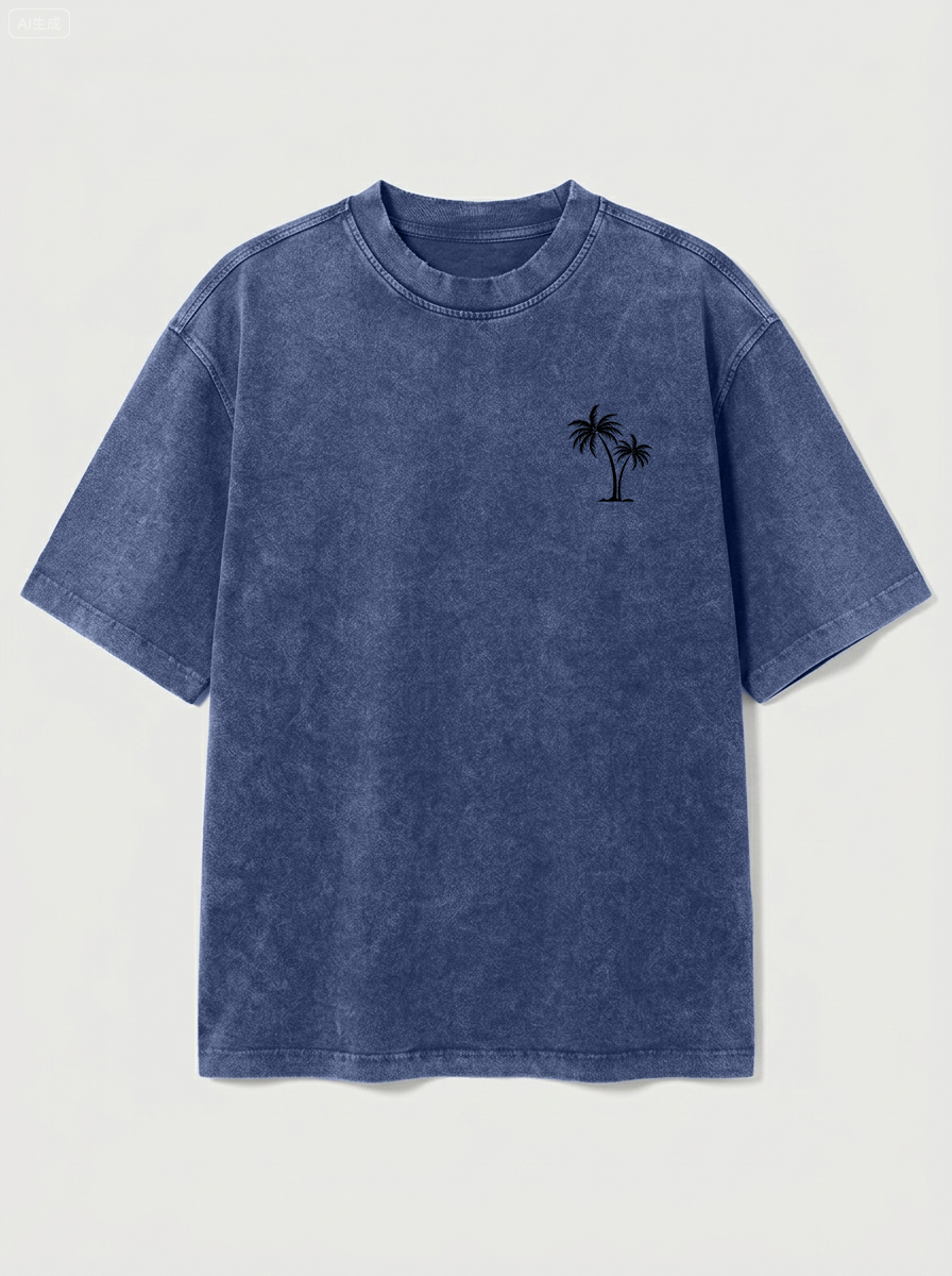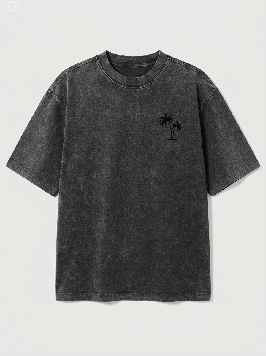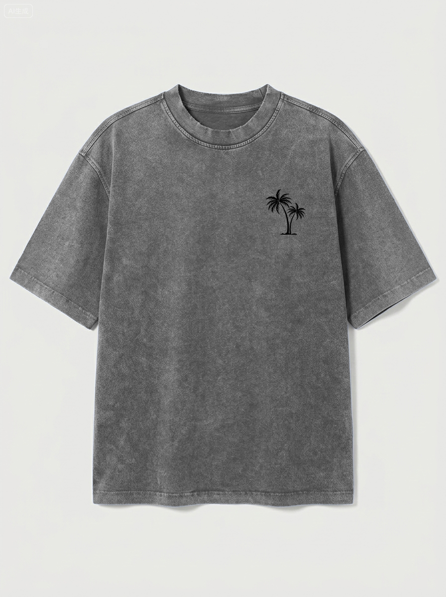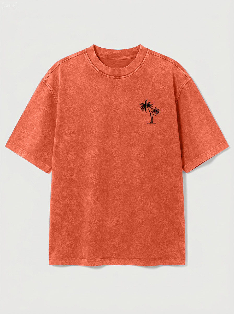100% Cotton Vintage Washed & Distressed Crew-Neck Short-Sleeve T-Shirt with Palm Tree Print