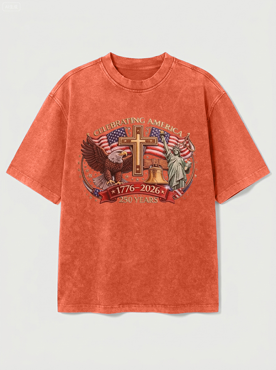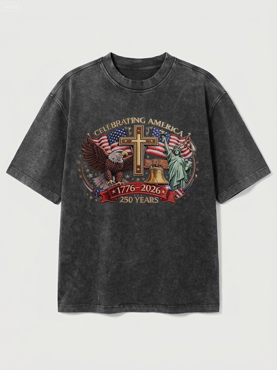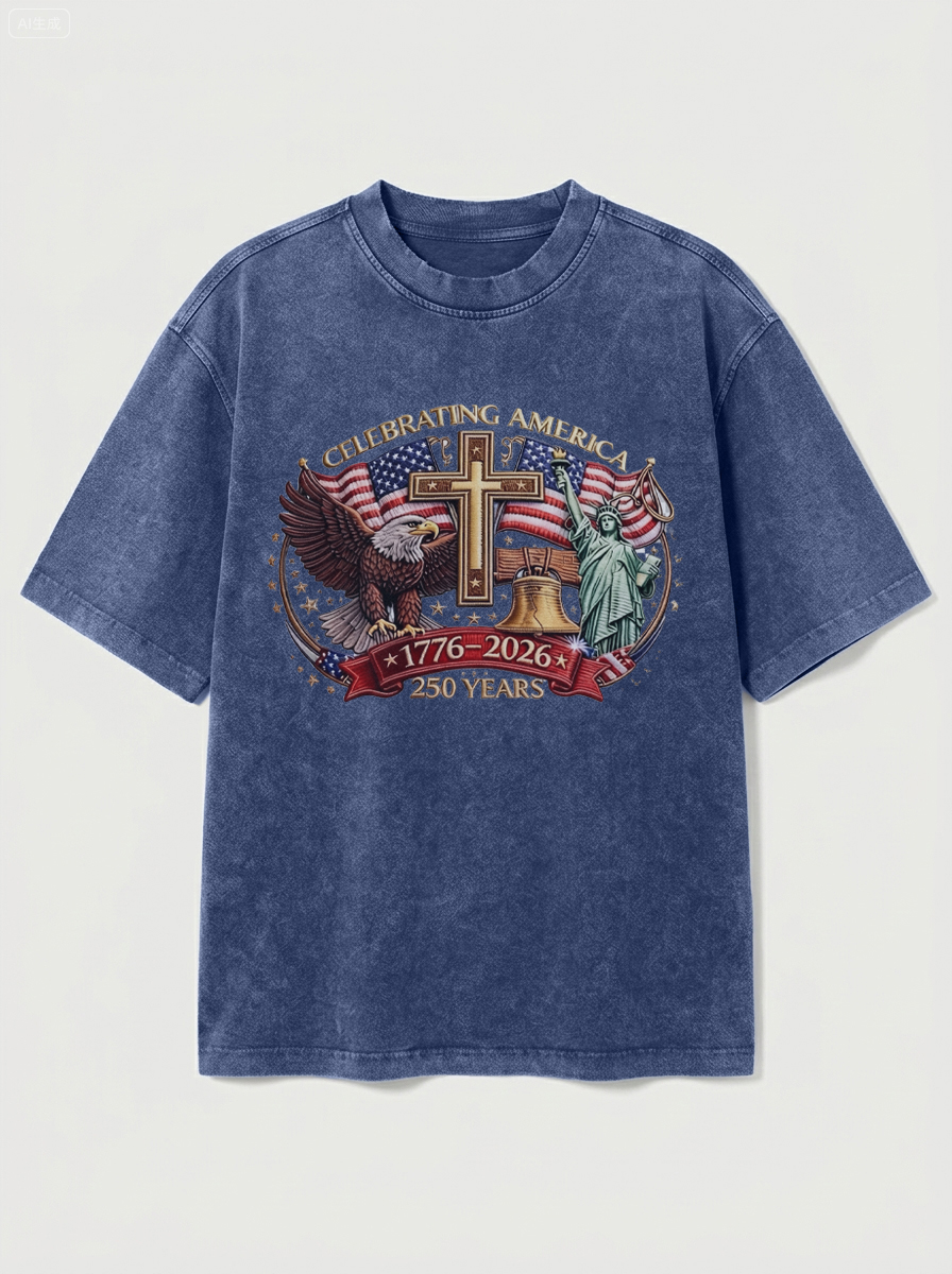 100% Cotton Vintage Washed & Distressed USA 250th Anniversary Crew Neck Short-Sleeve T-Shirt