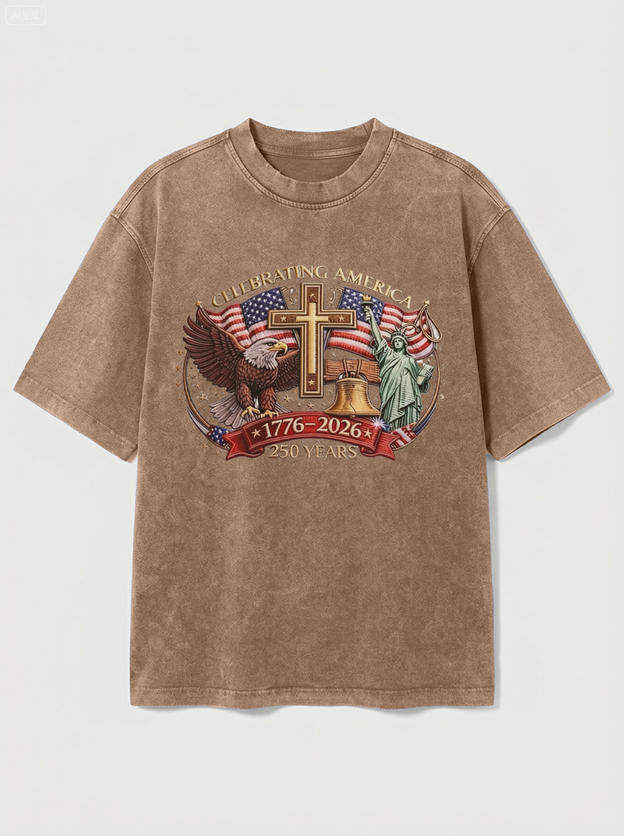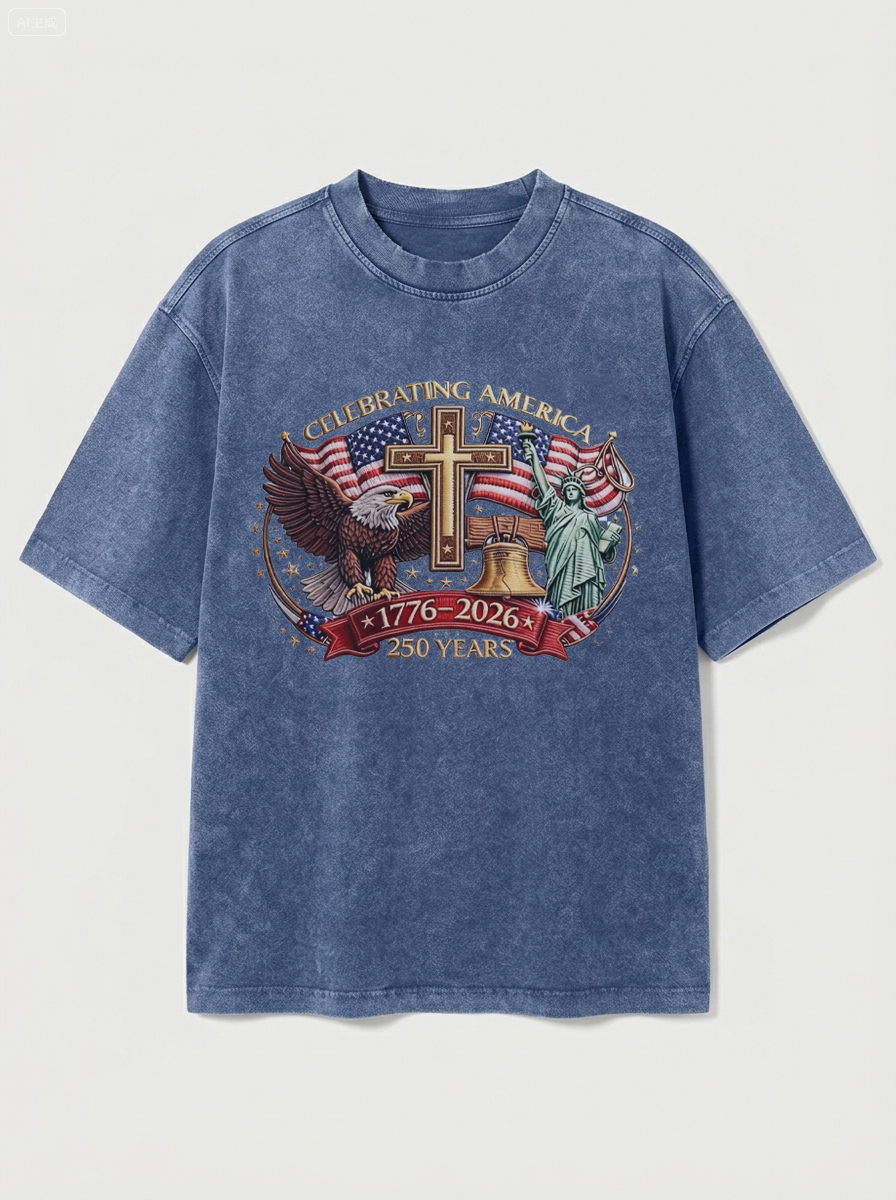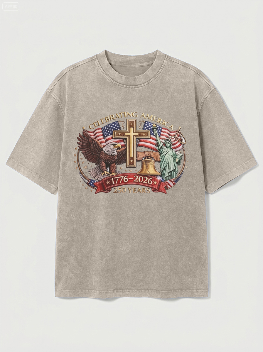 100% Cotton Vintage Washed & Distressed USA 250th Anniversary Crew Neck Short-Sleeve T-Shirt