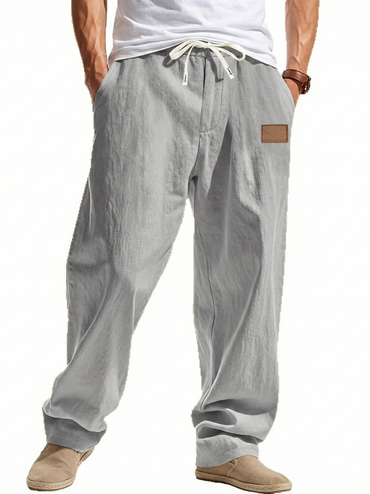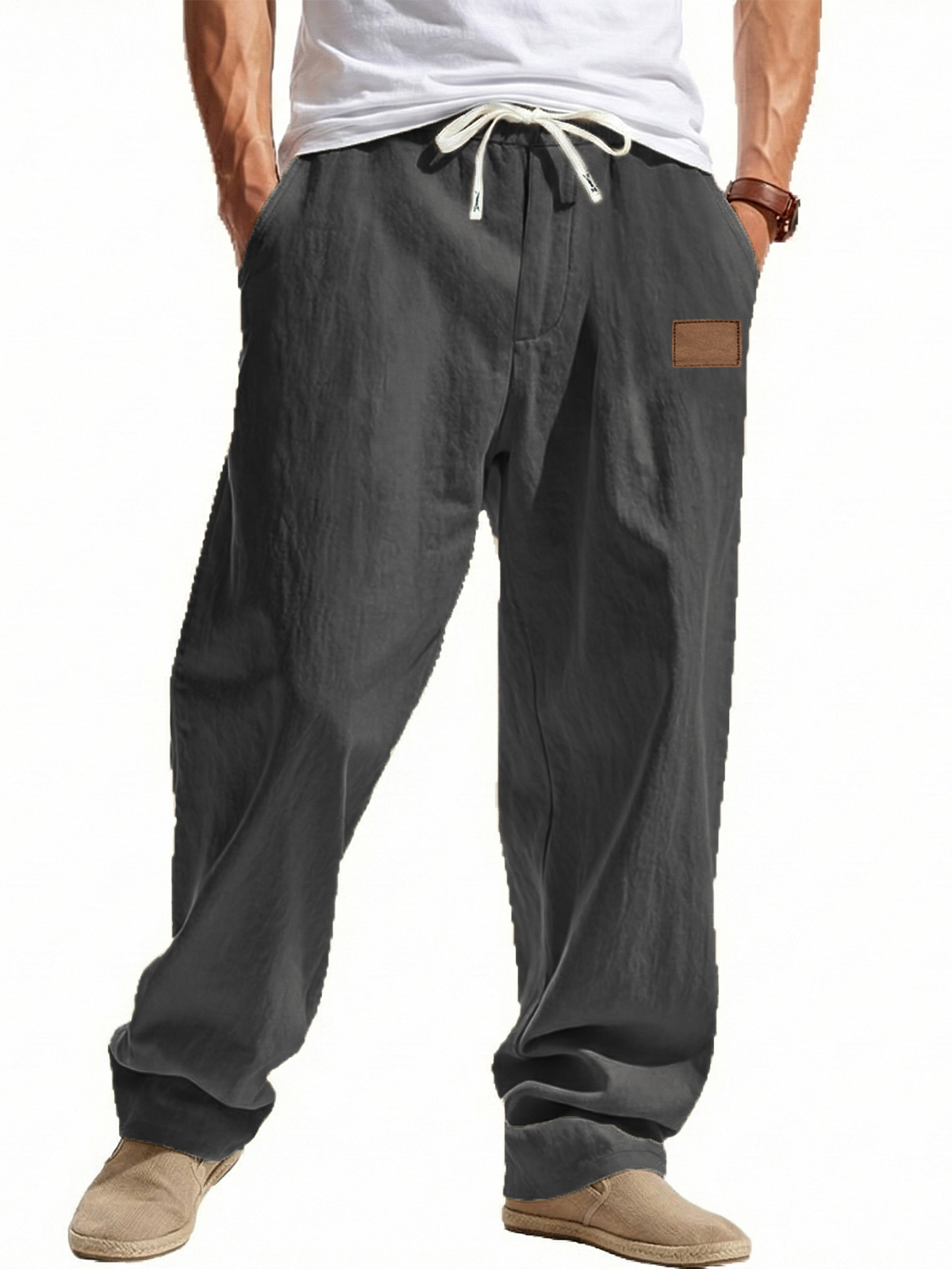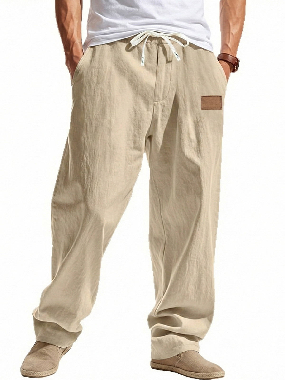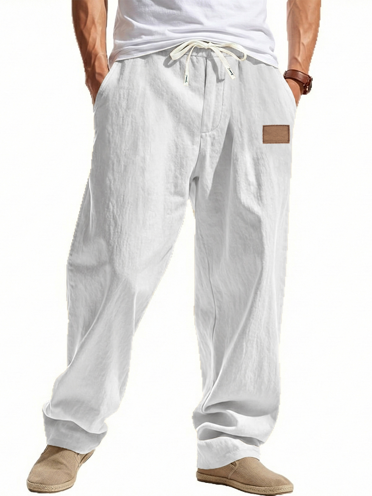 Loose-fitting Linen Wide-leg Beach Trousers with Embroidered Label