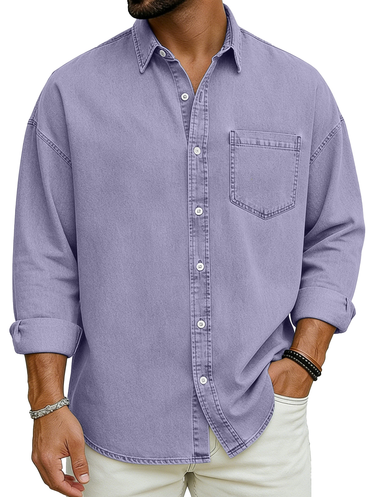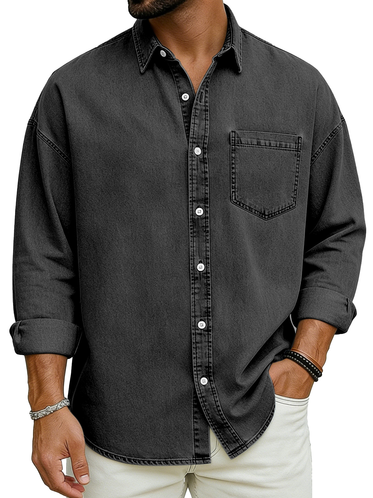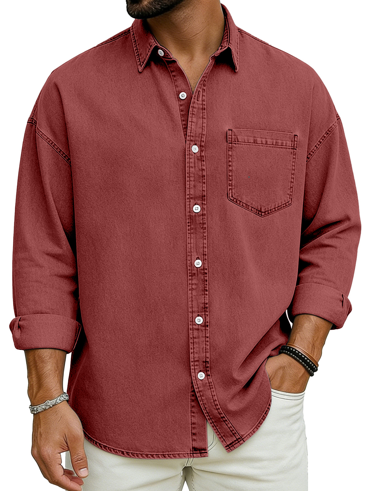 Men's Basic Solid Color Retro Lapel Button-down Long-sleeved Shirt