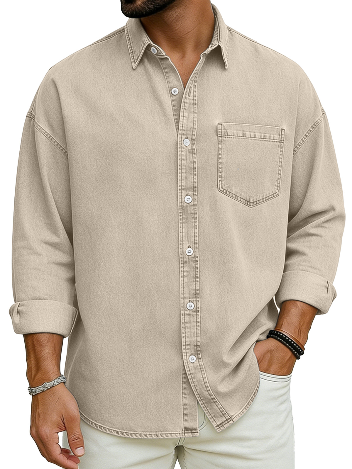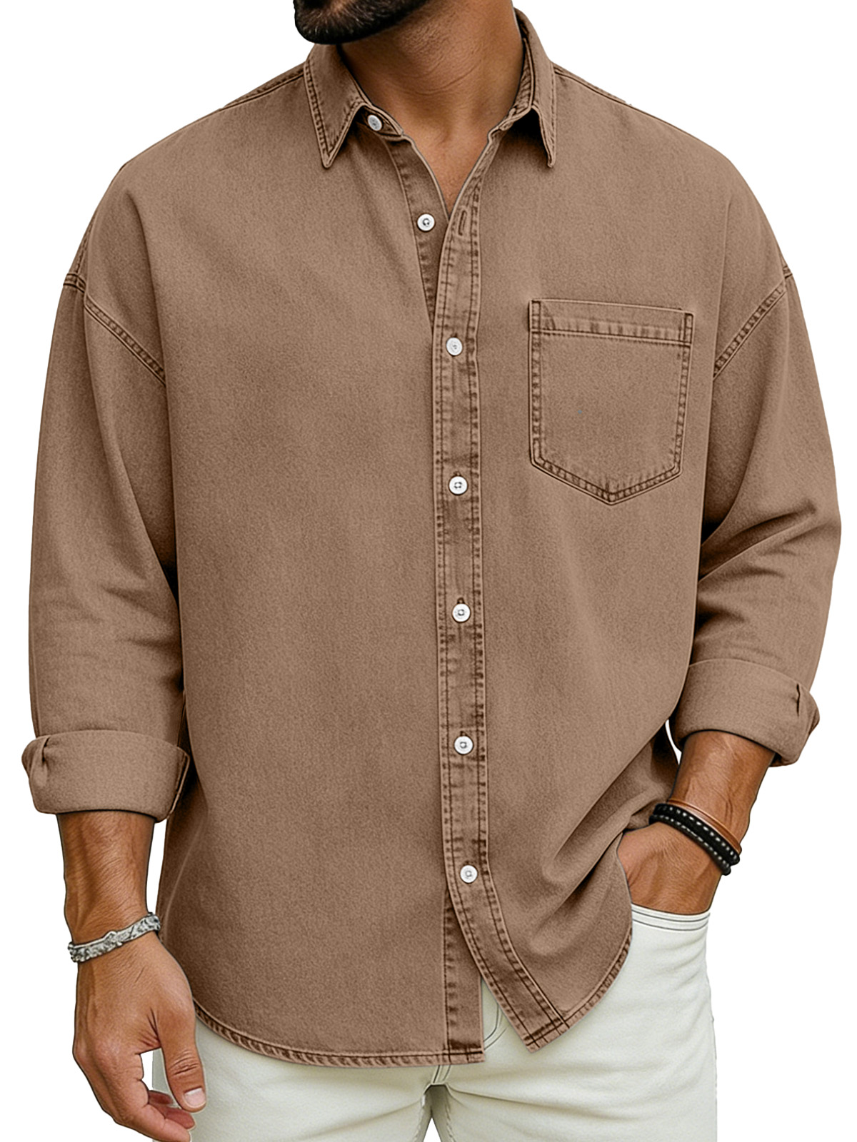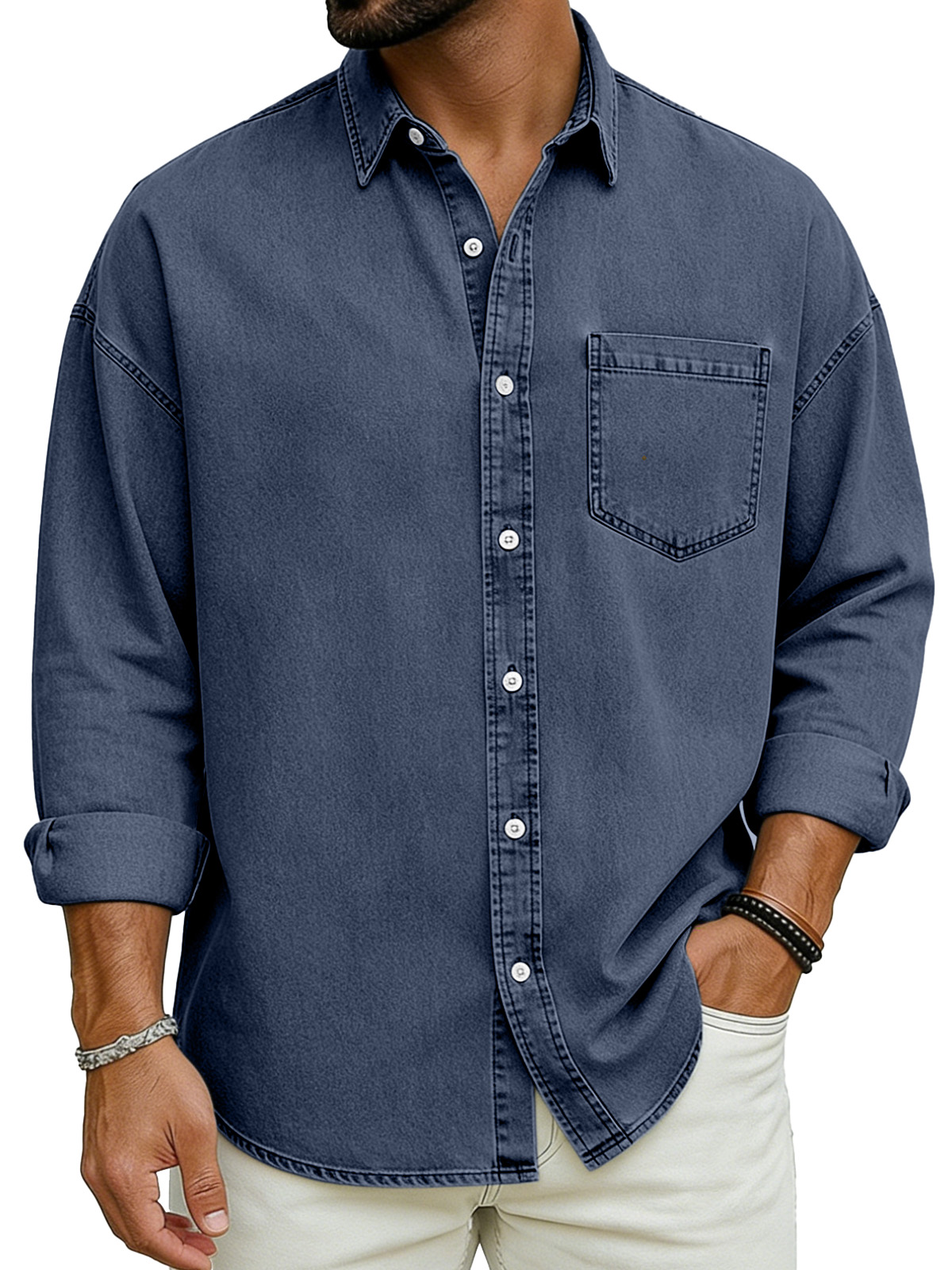 Men's Basic Solid Color Retro Lapel Button-down Long-sleeved Shirt
