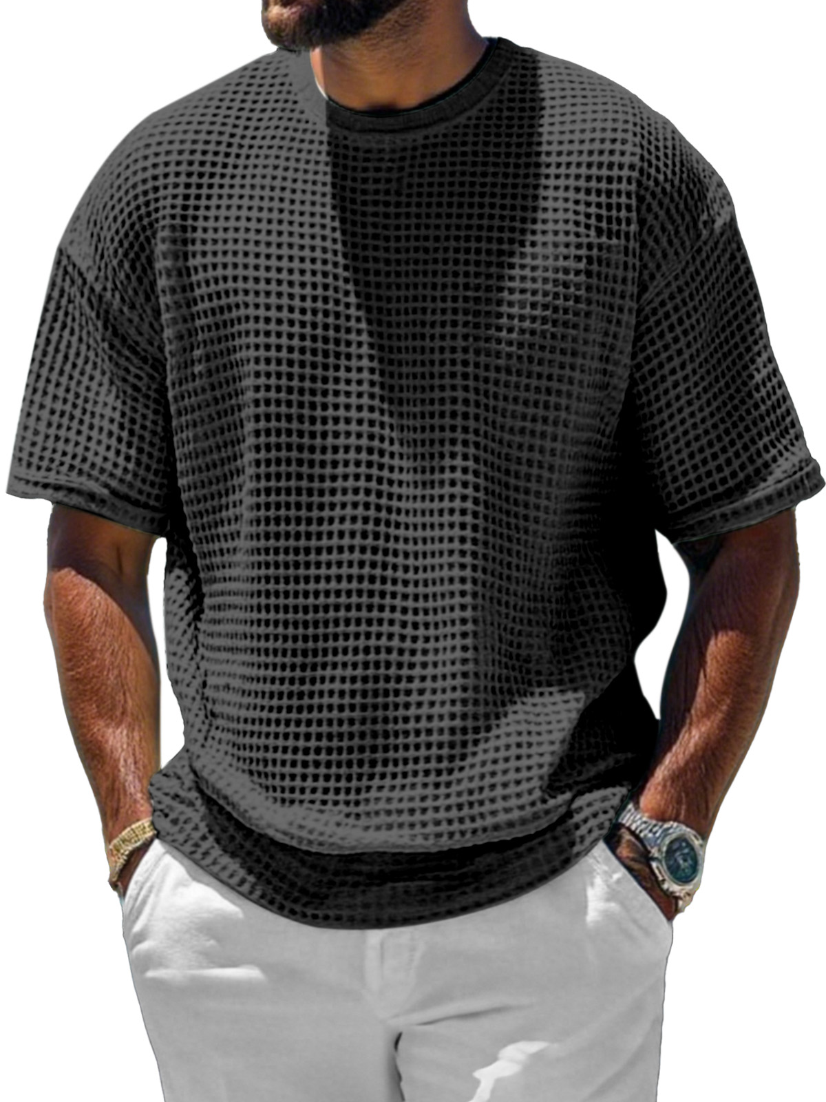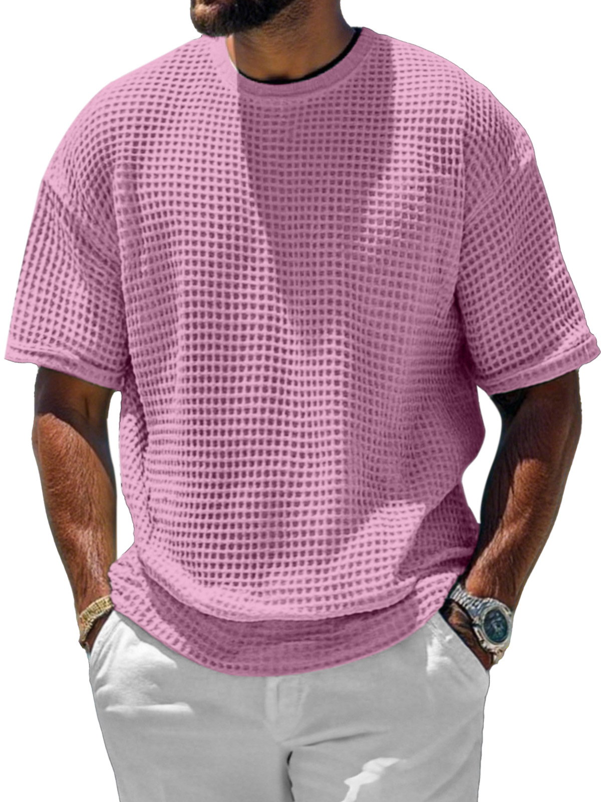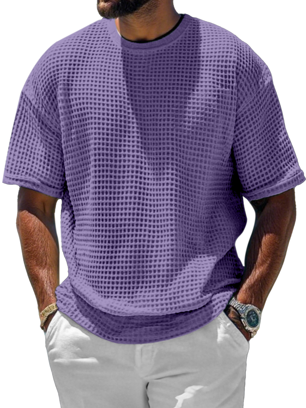 Men's Casual And Comfortable Short-sleeved Solid Color Waffle Round Neck T-shirt