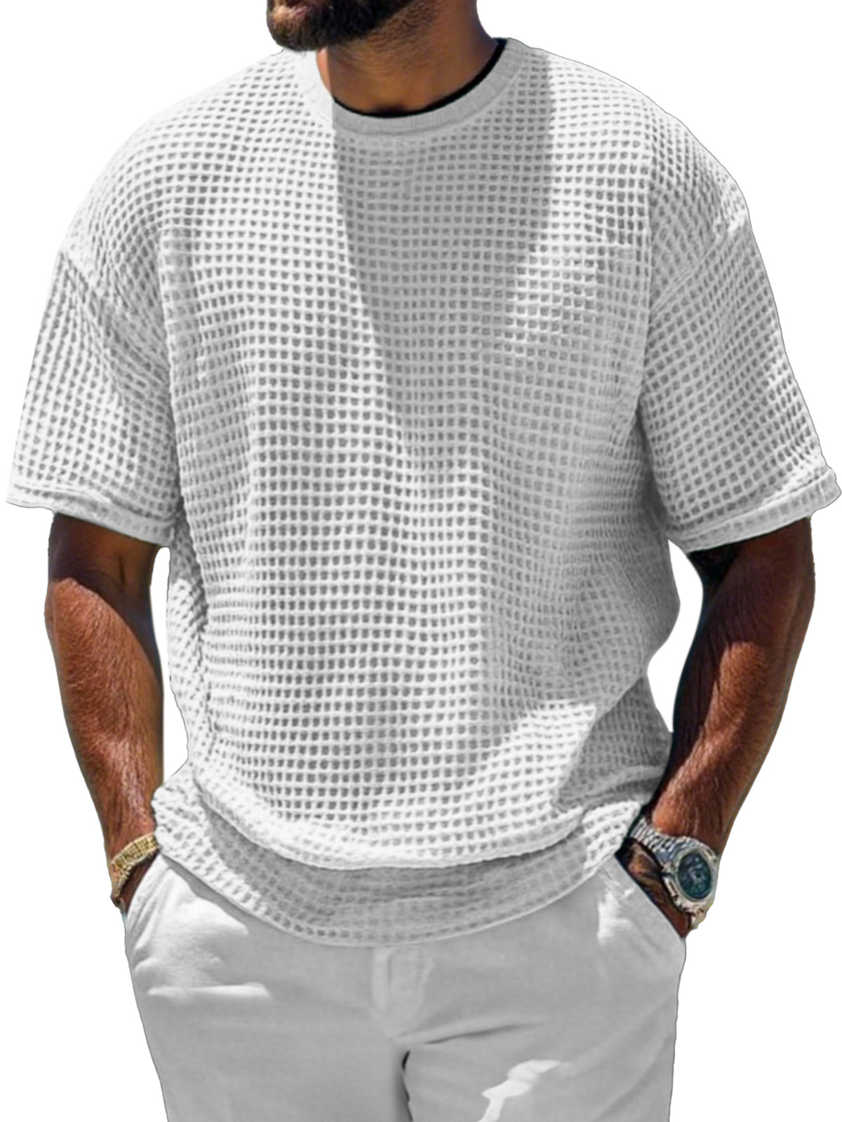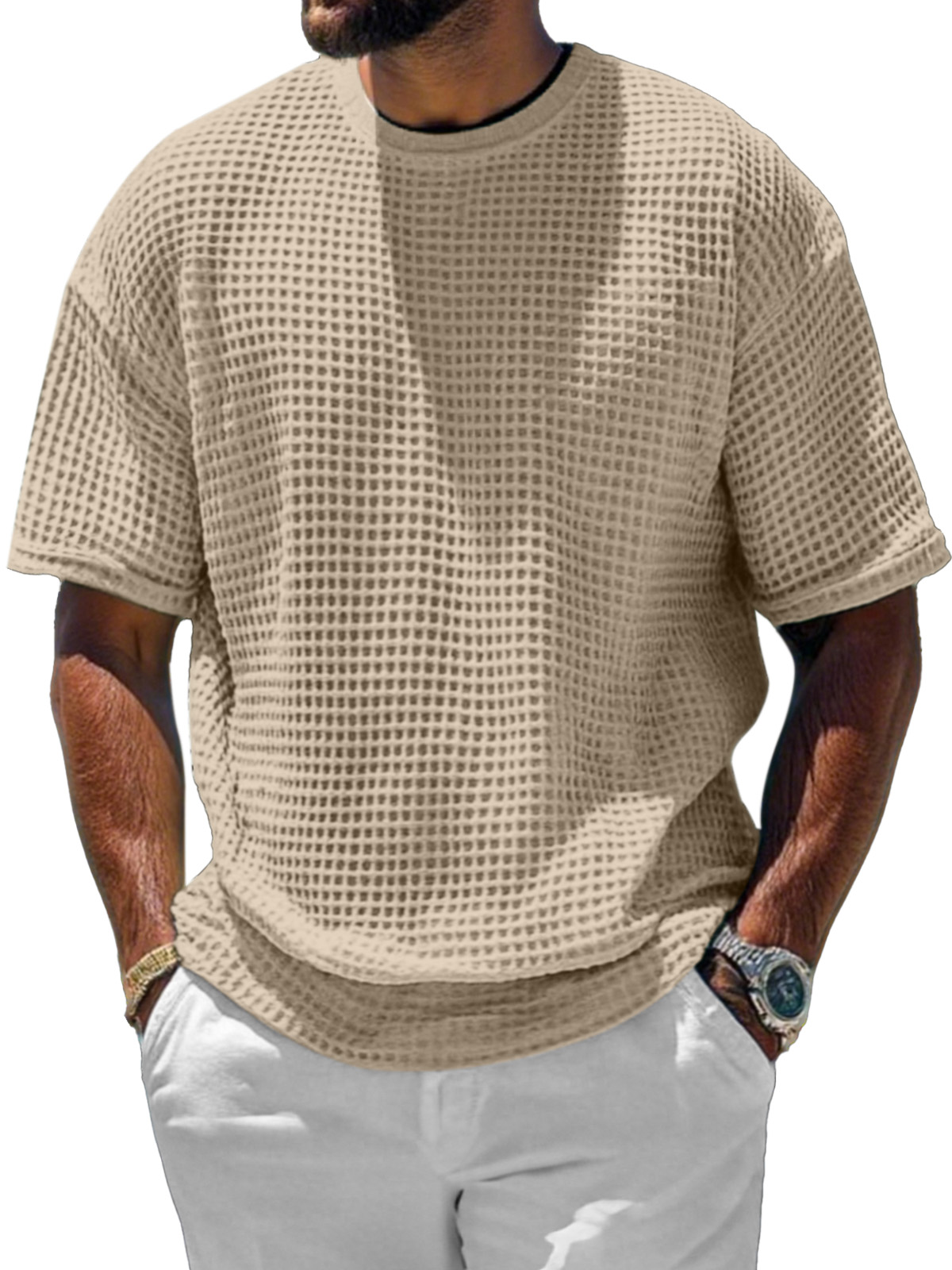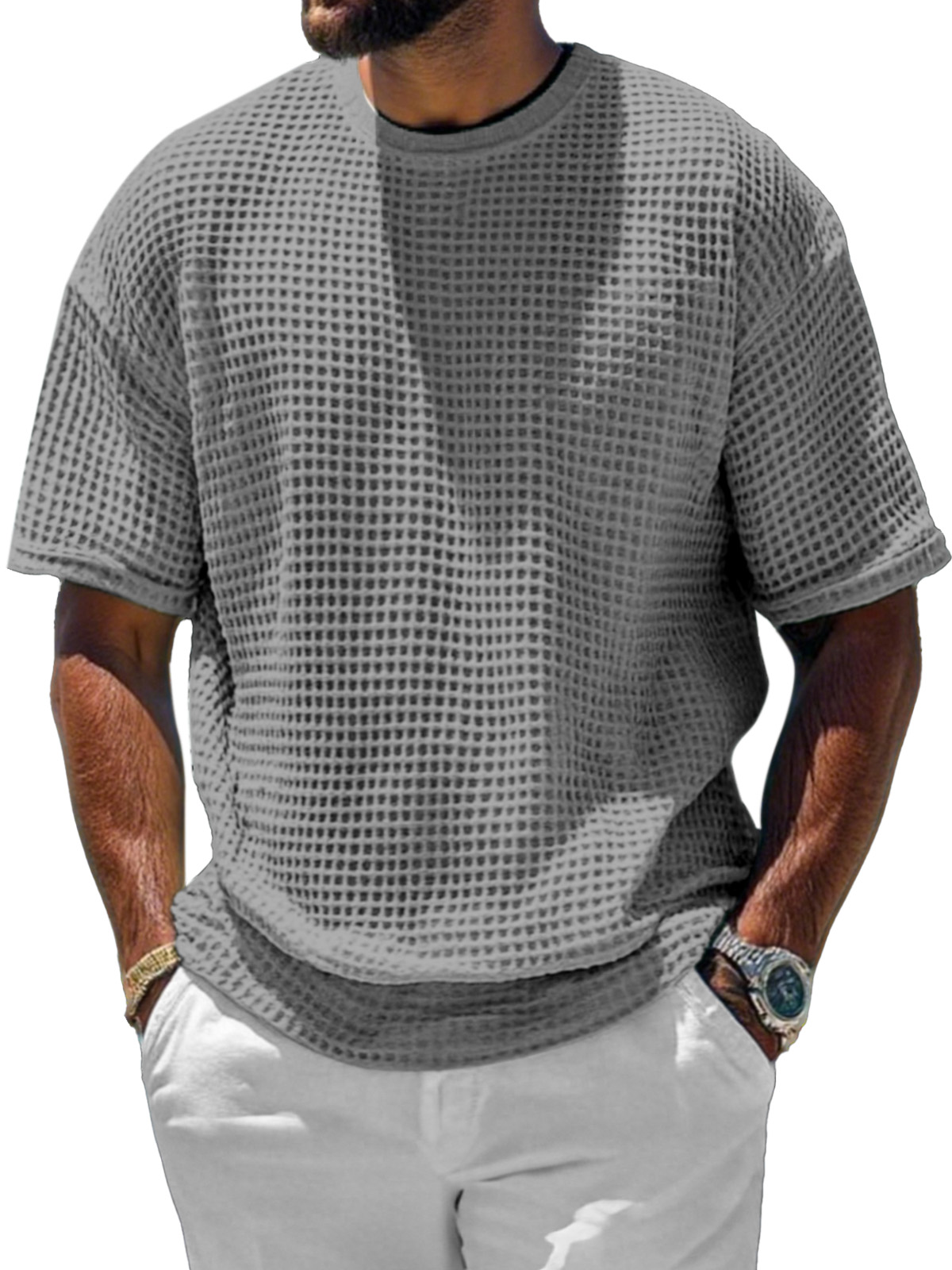 Men's Casual And Comfortable Short-sleeved Solid Color Waffle Round Neck T-shirt