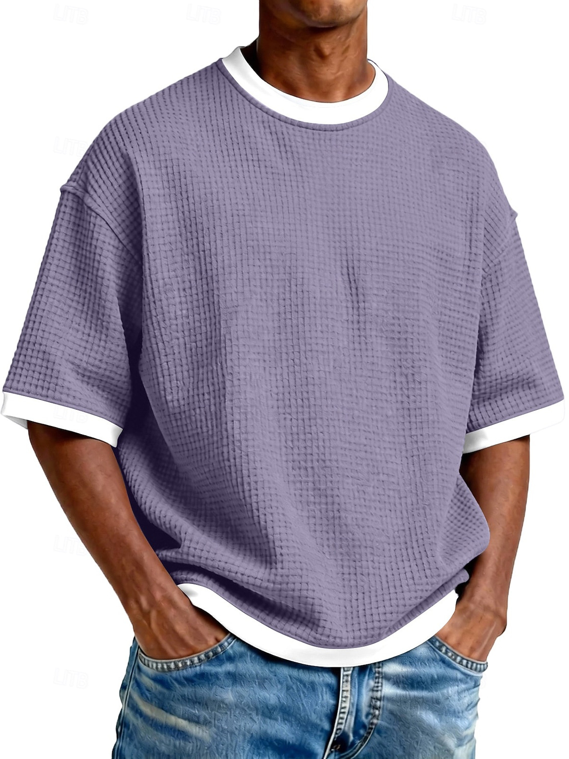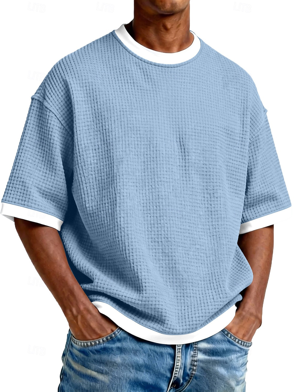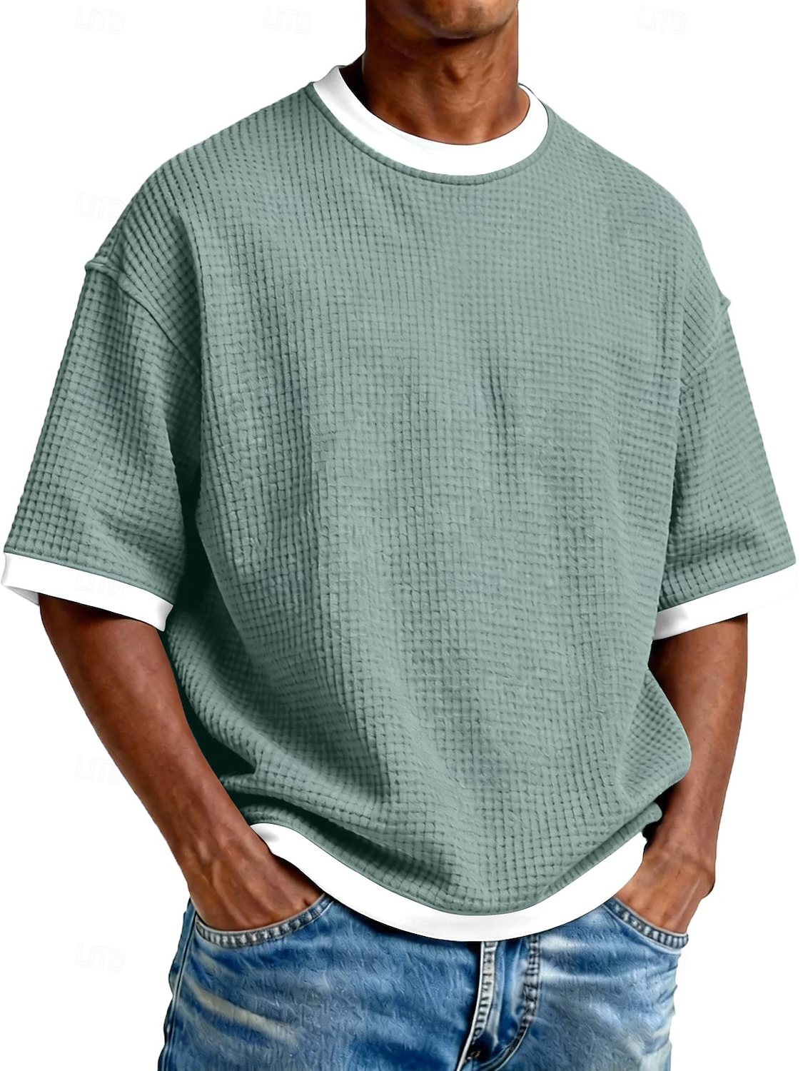 Men's Casual And Stylish Waffle-knit Color-block Crew Neck T-shirt