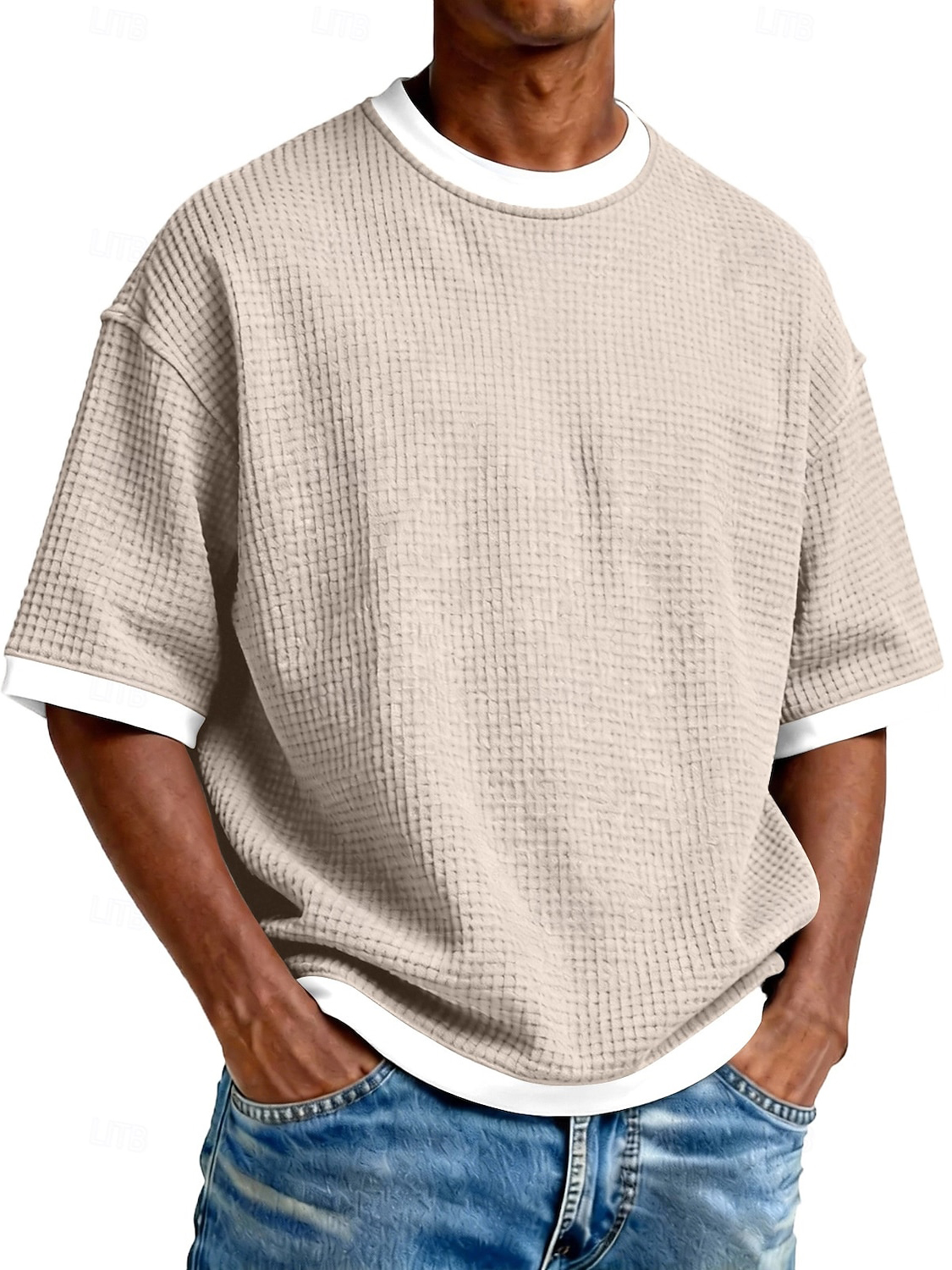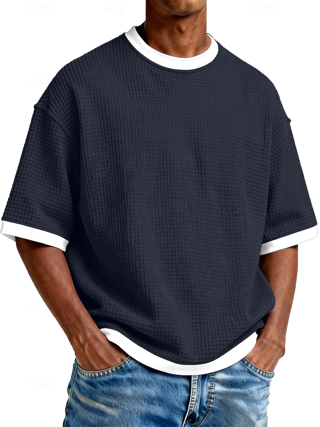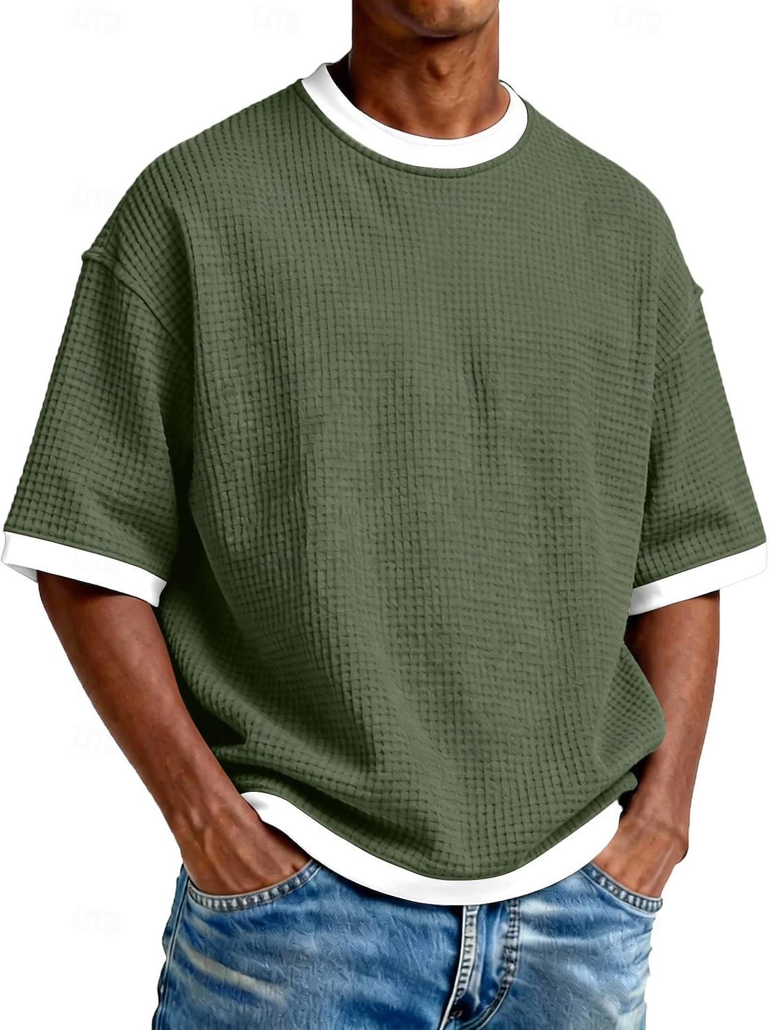 Men's Casual And Stylish Waffle-knit Color-block Crew Neck T-shirt