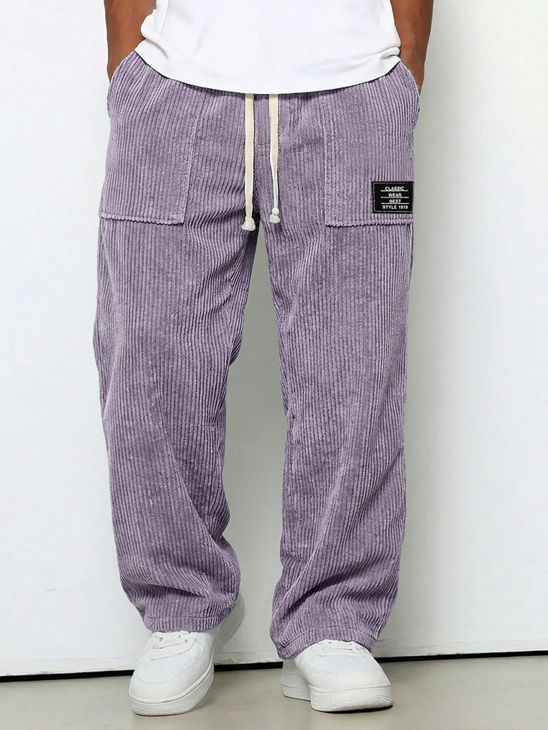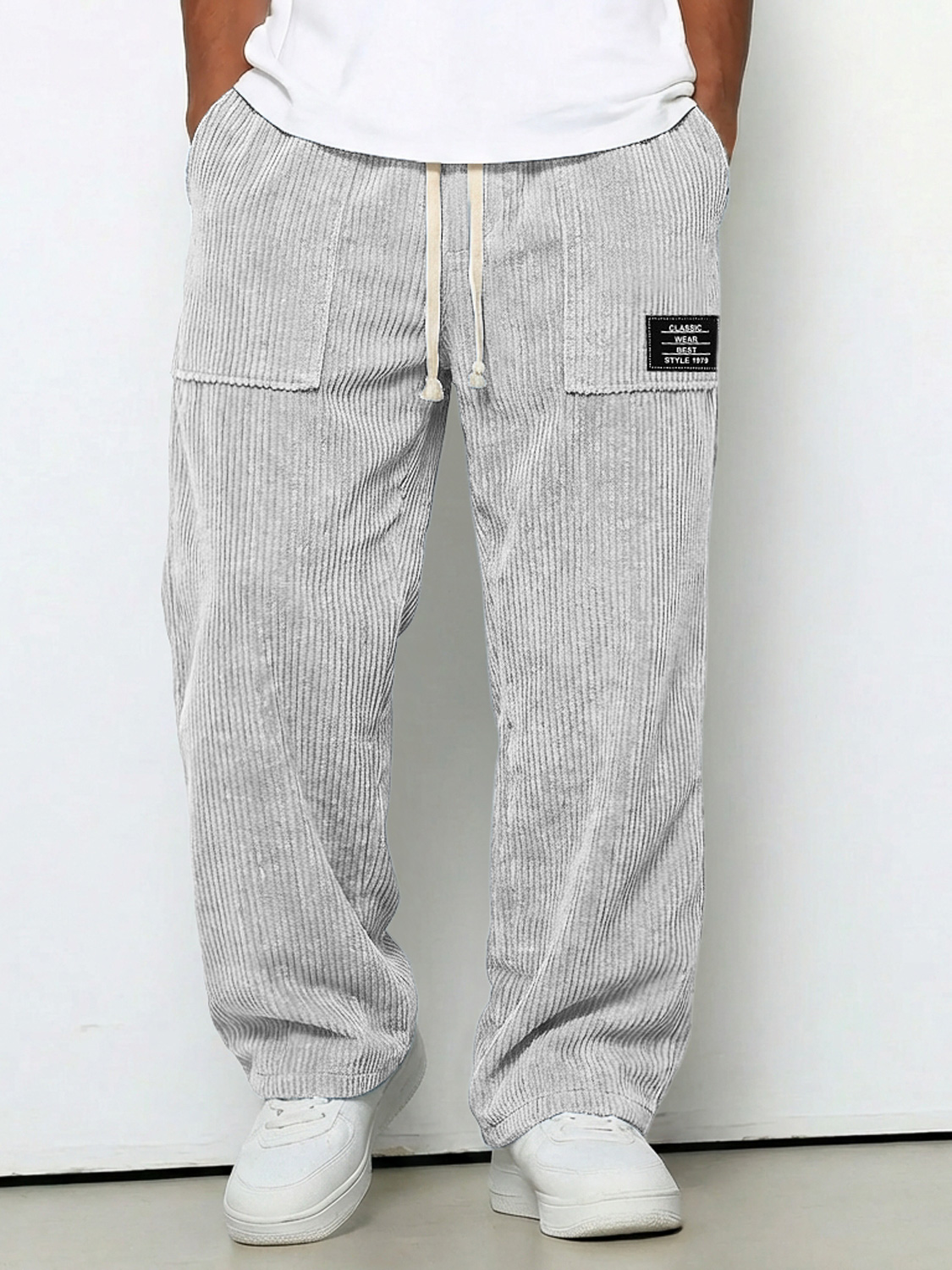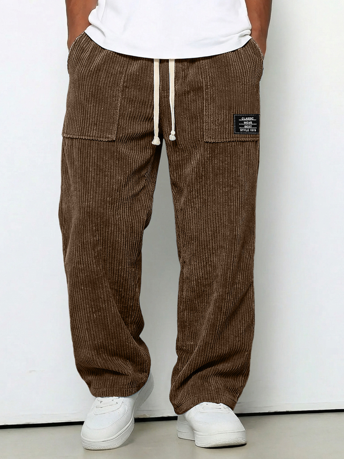Men's Casual Corduroy Pants With Patch Pockets, Embroidered Logo, And Elastic Waistband