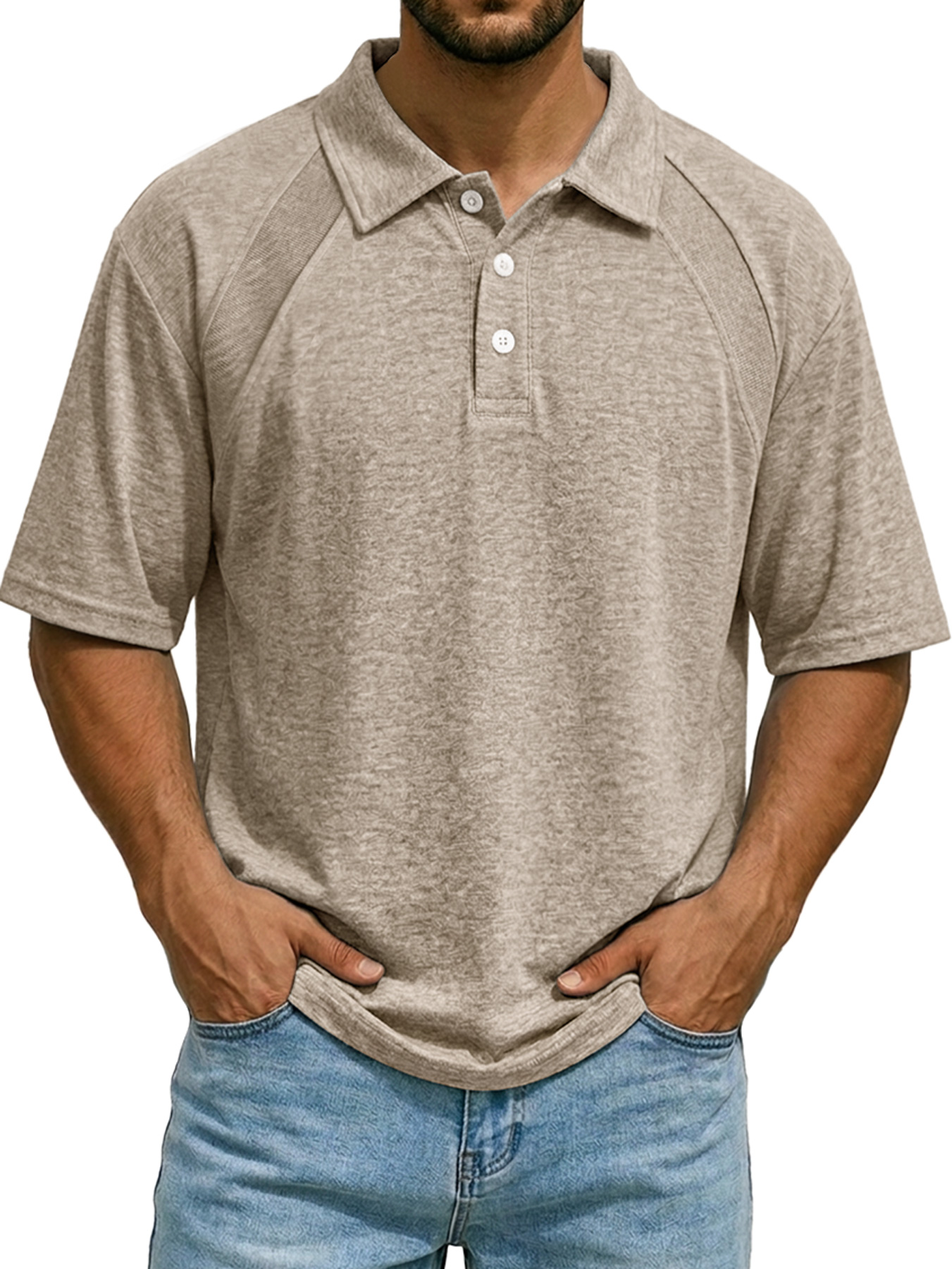 Men's Casual Raglan Polo Shirt with Turn-Down Collar and Button-Up Short Sleeve