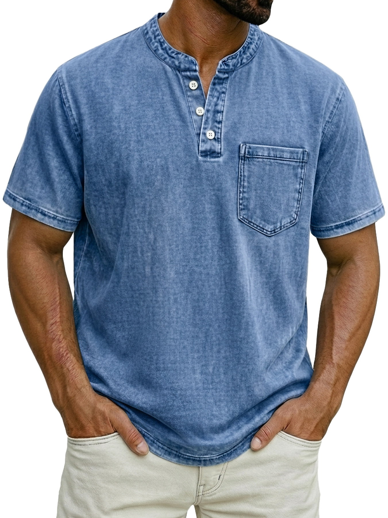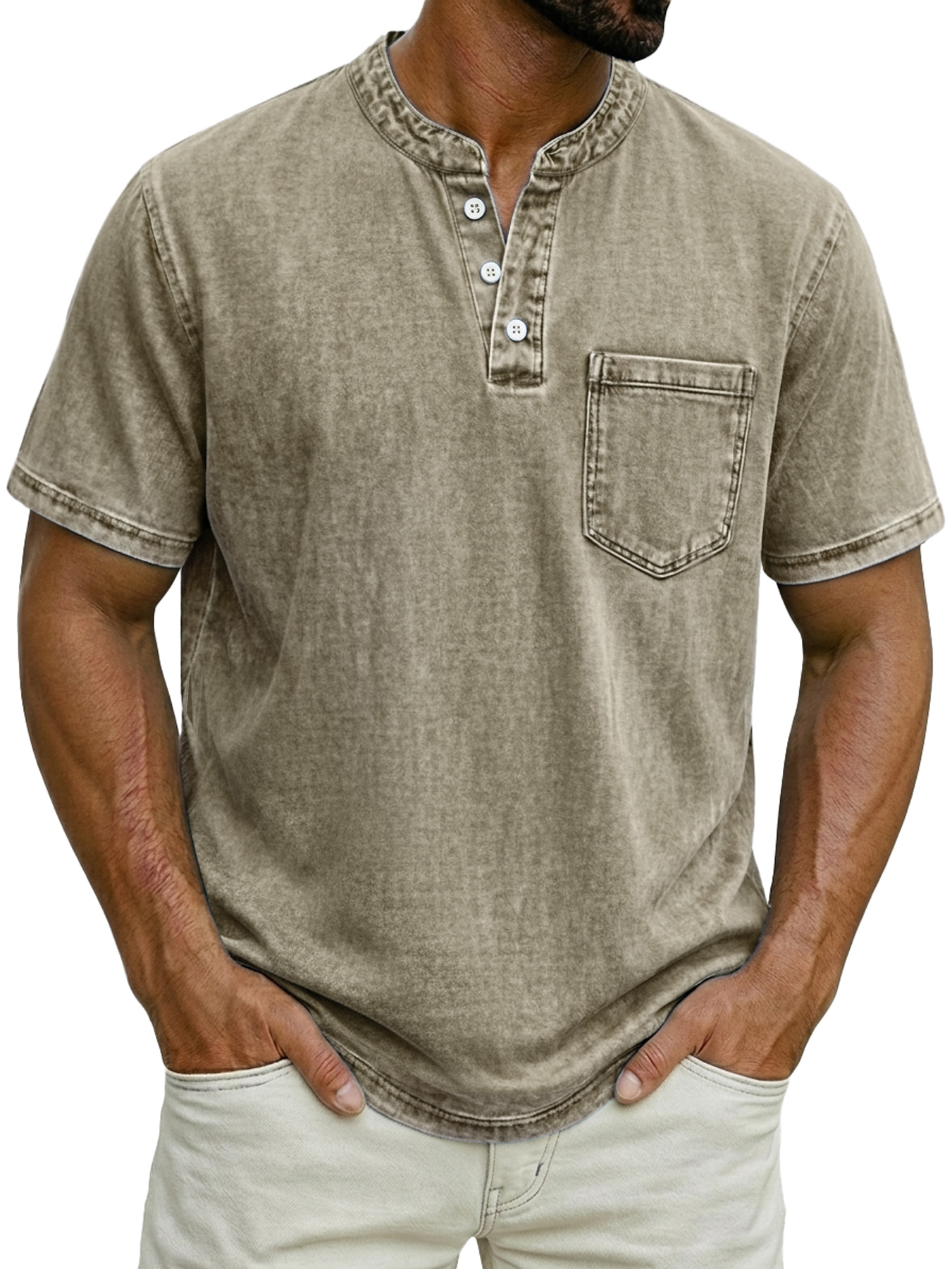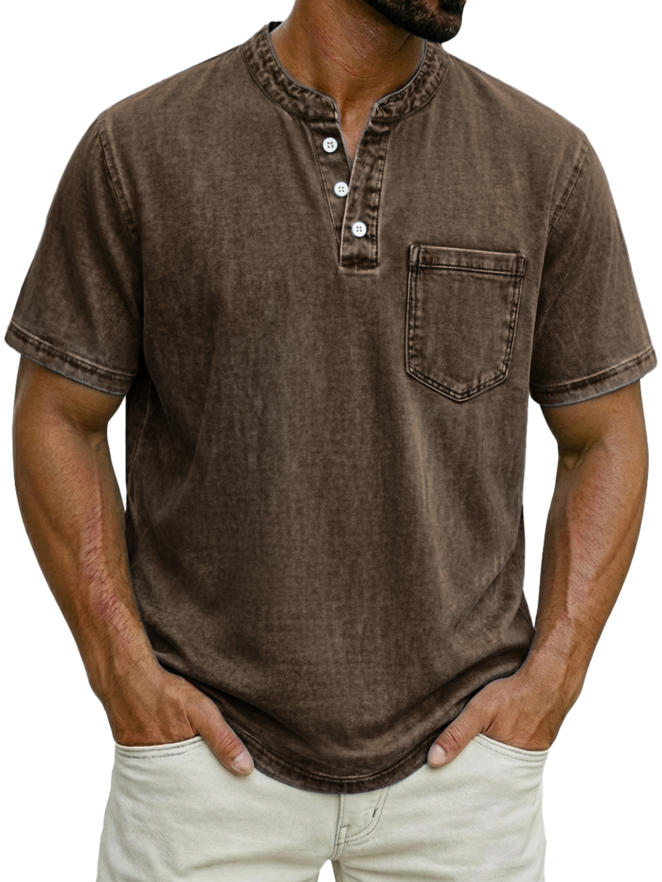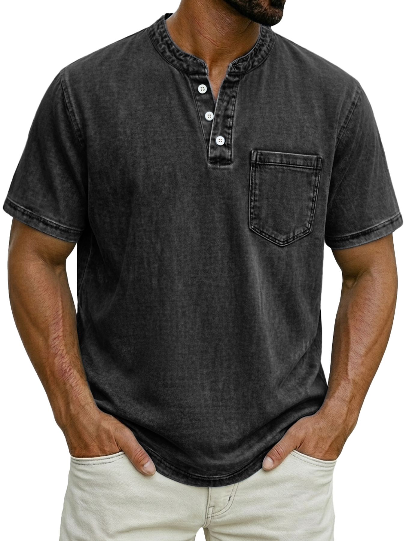 Men's Casual Retro Stand Collar Button-Down Short Sleeve Henley Shirt