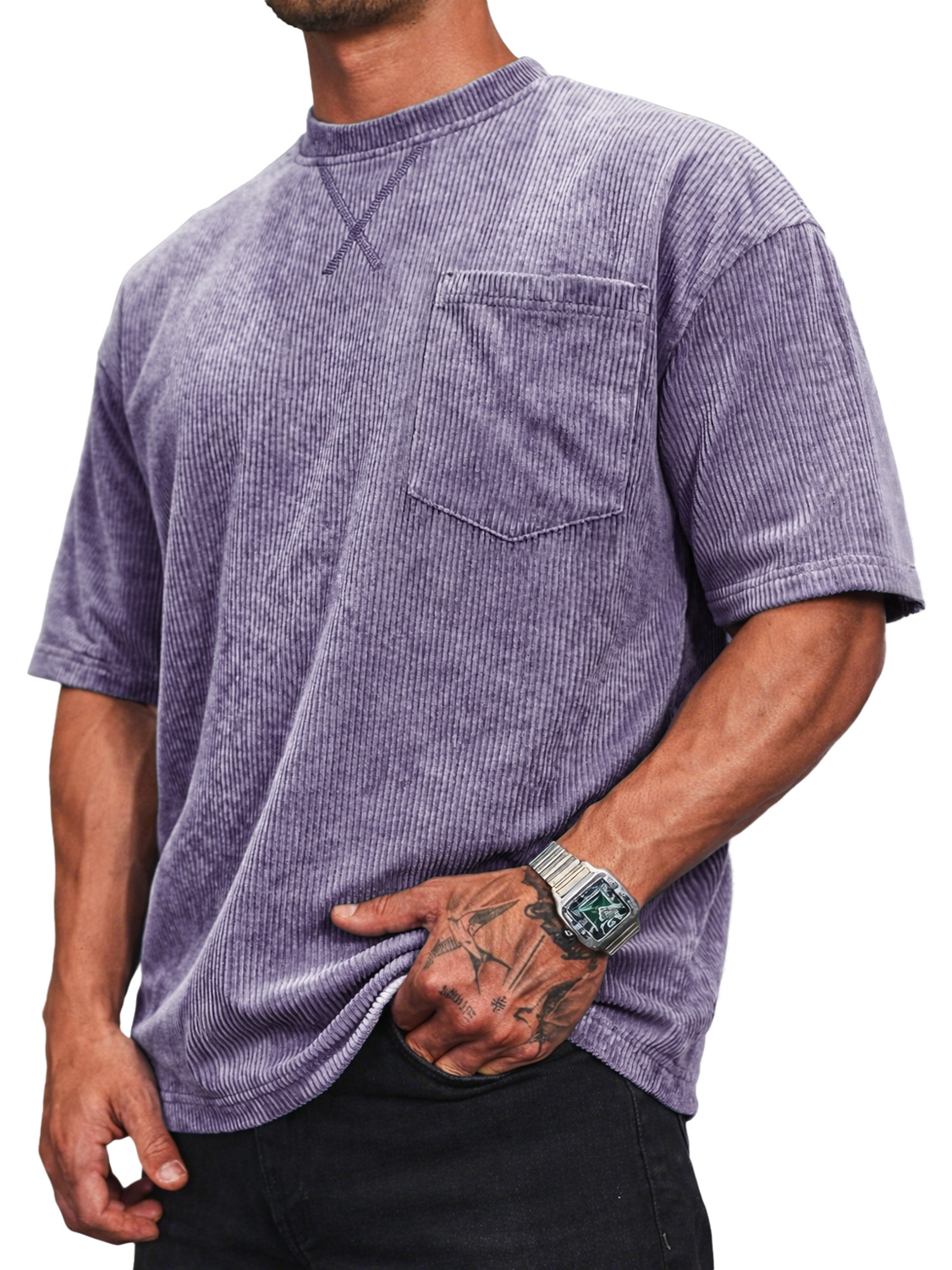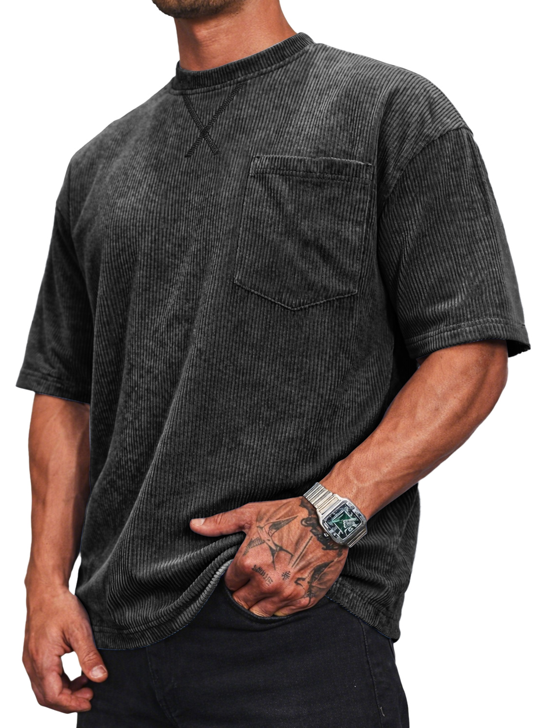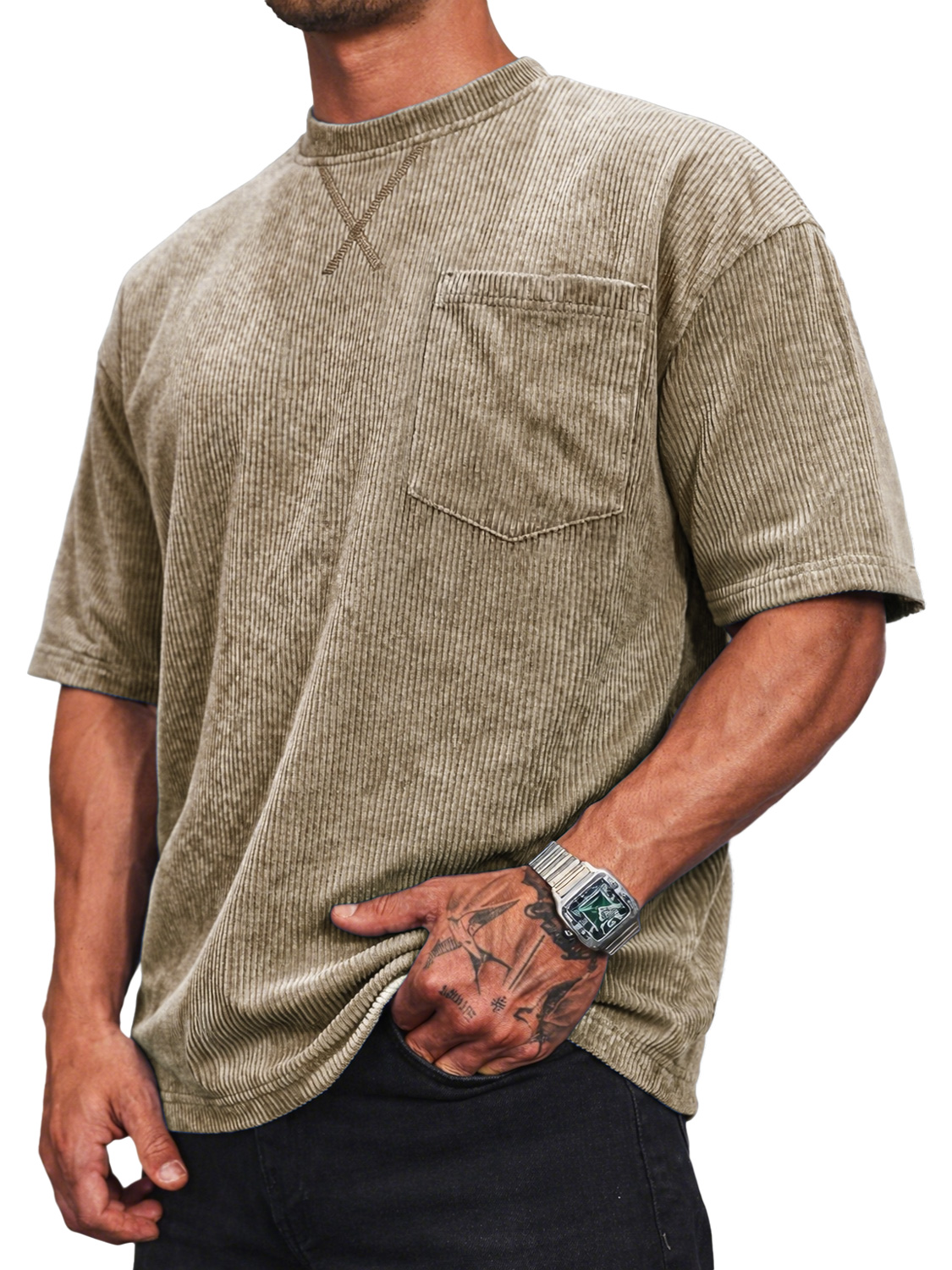 Men's Corduroy Crew Neck Short-sleeved T-shirt With A Crossover Design