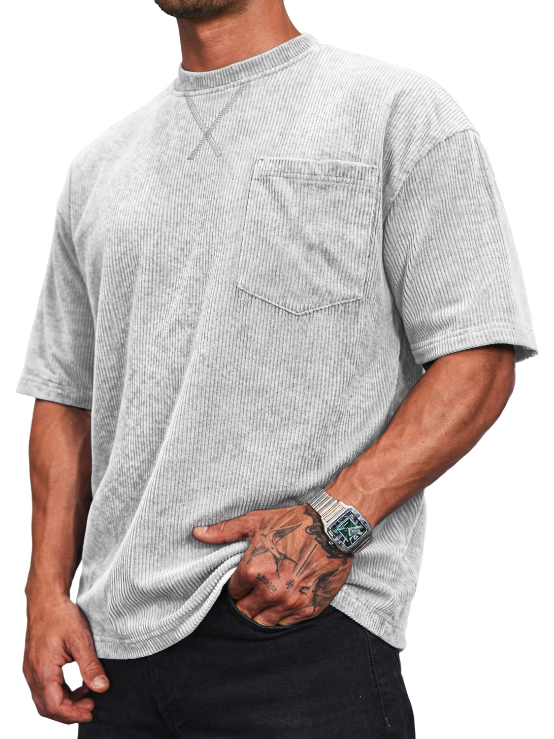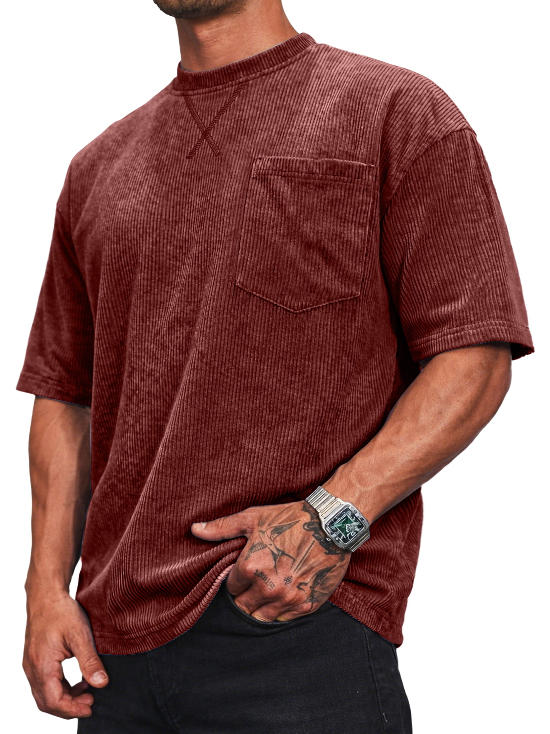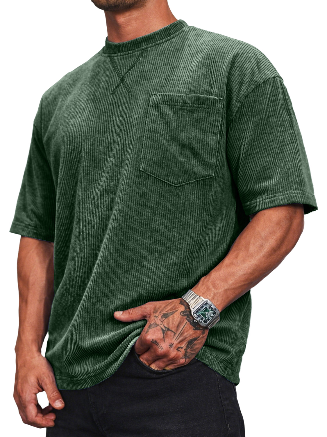 Men's Corduroy Crew Neck Short-sleeved T-shirt With A Crossover Design