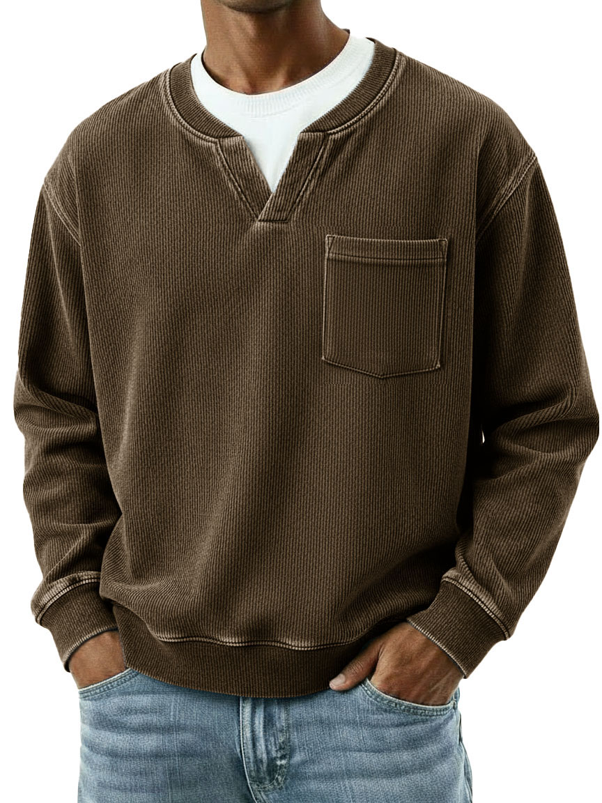 Men's Fashionable Casual Ribbed Fabric Faux Two-Piece Pocket Long-Sleeve T-Shirt