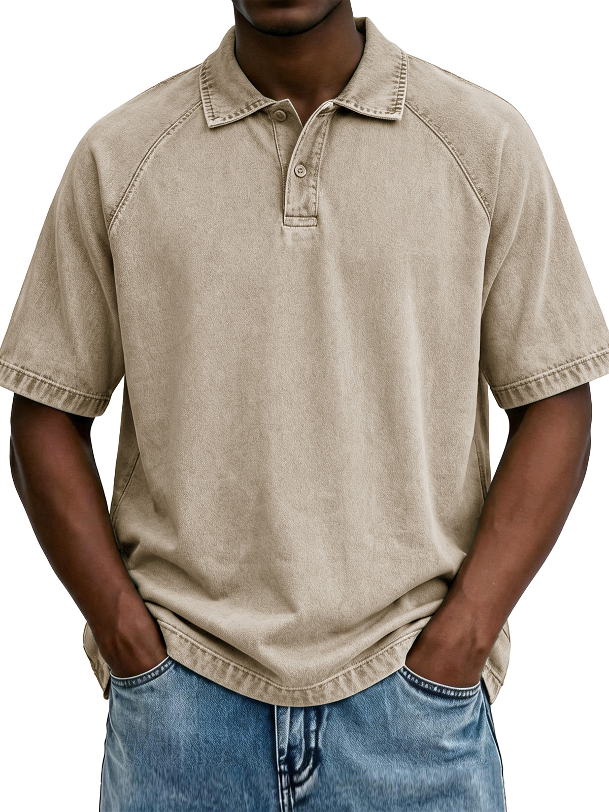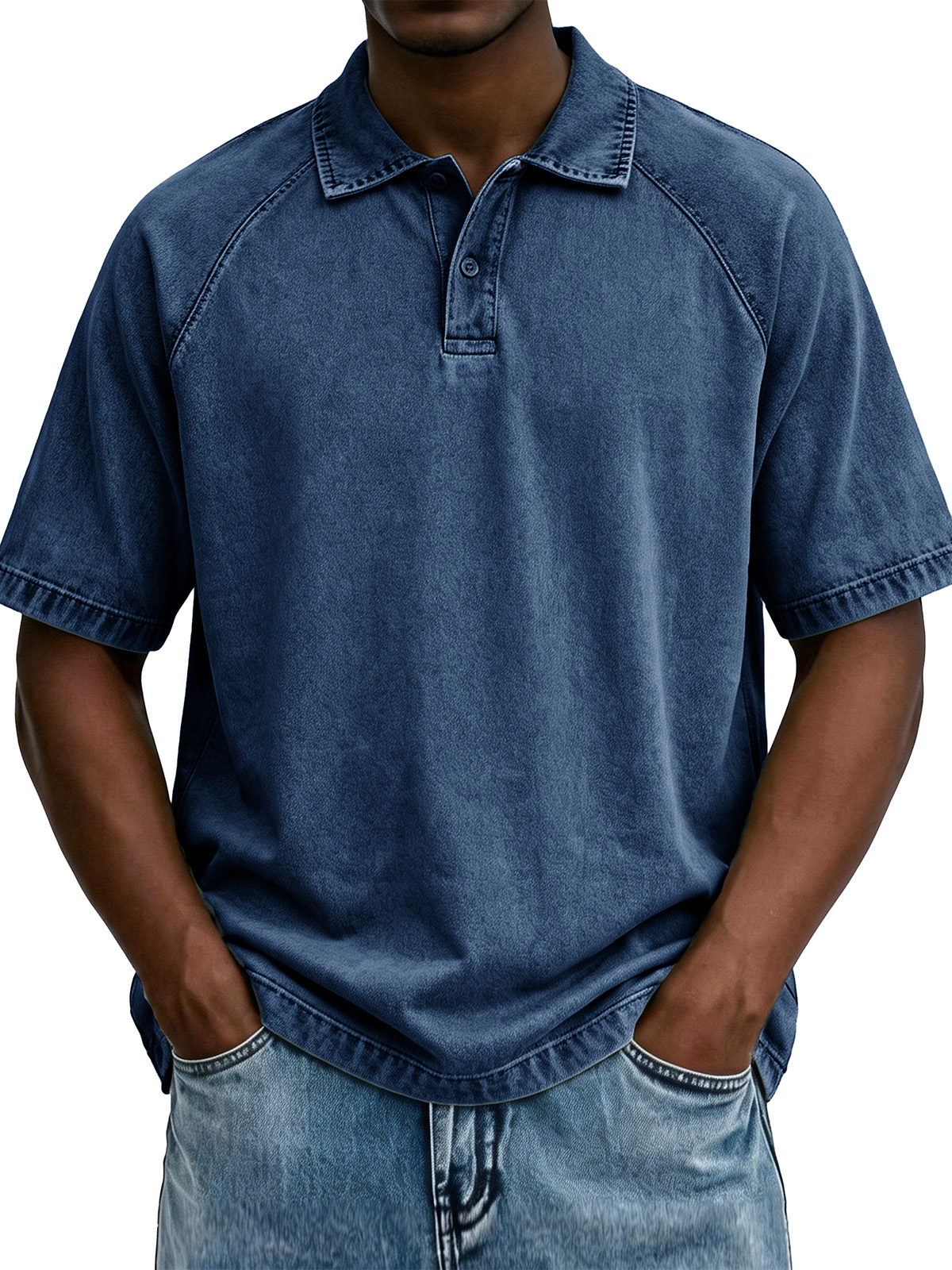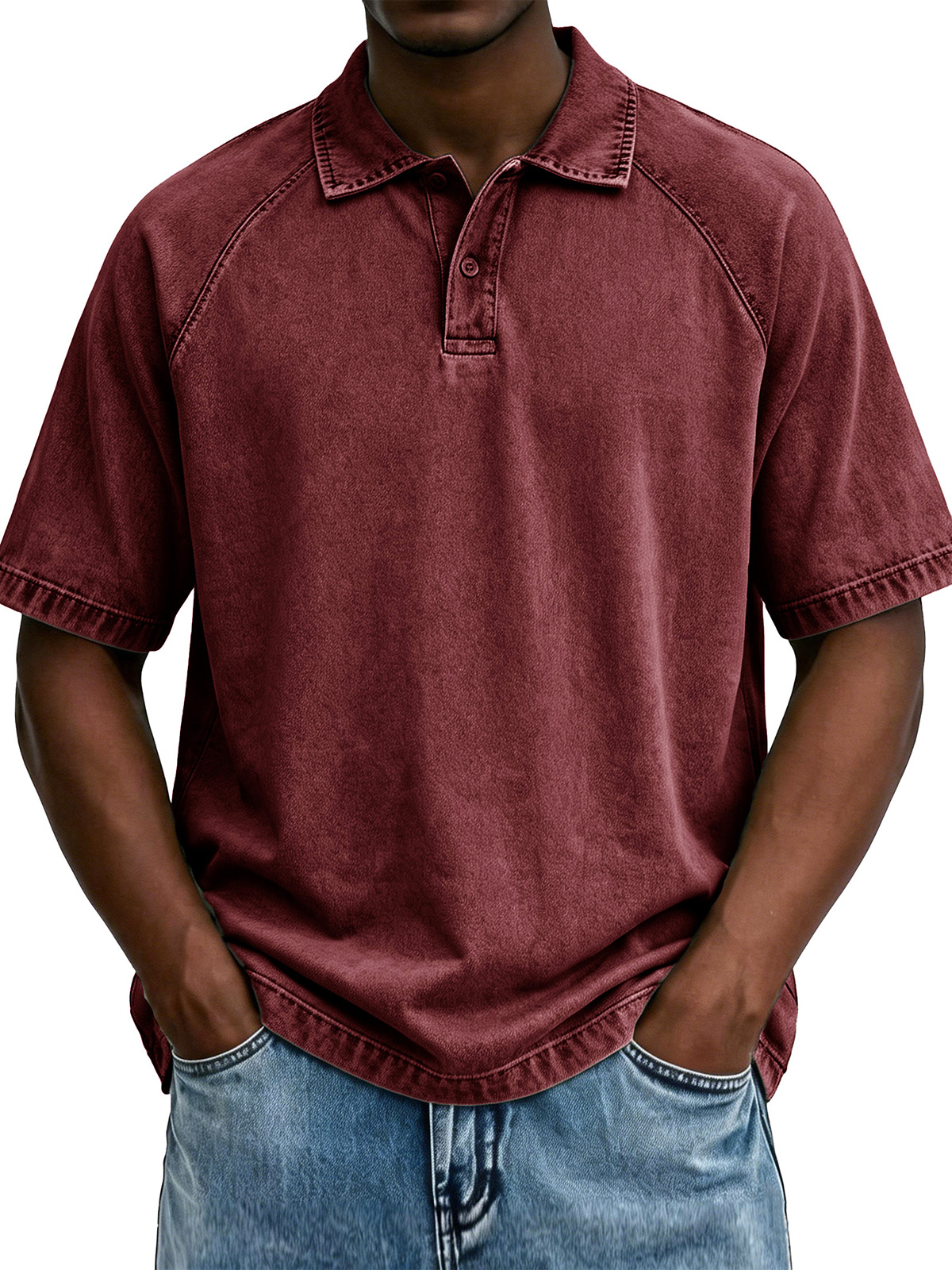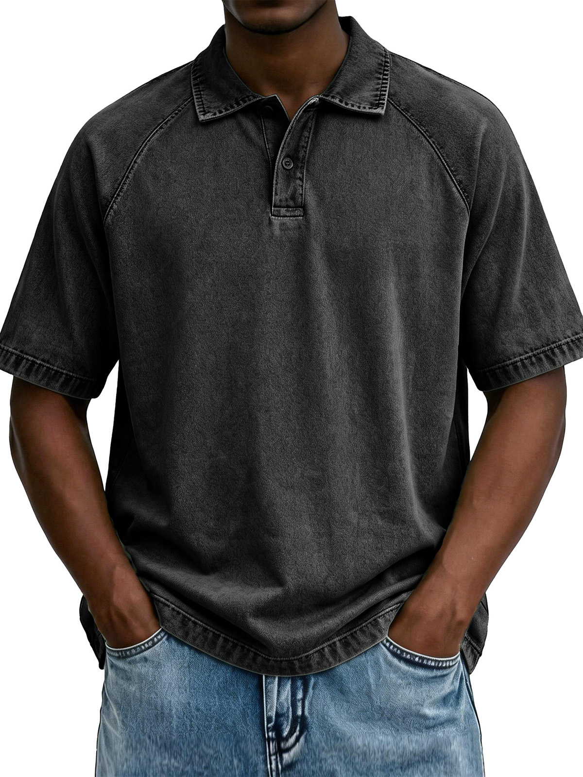 Men's Fashionable Raglan Distressed Collared Loose Short-Sleeve Polo Shirt