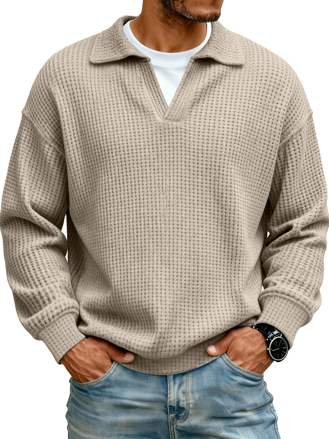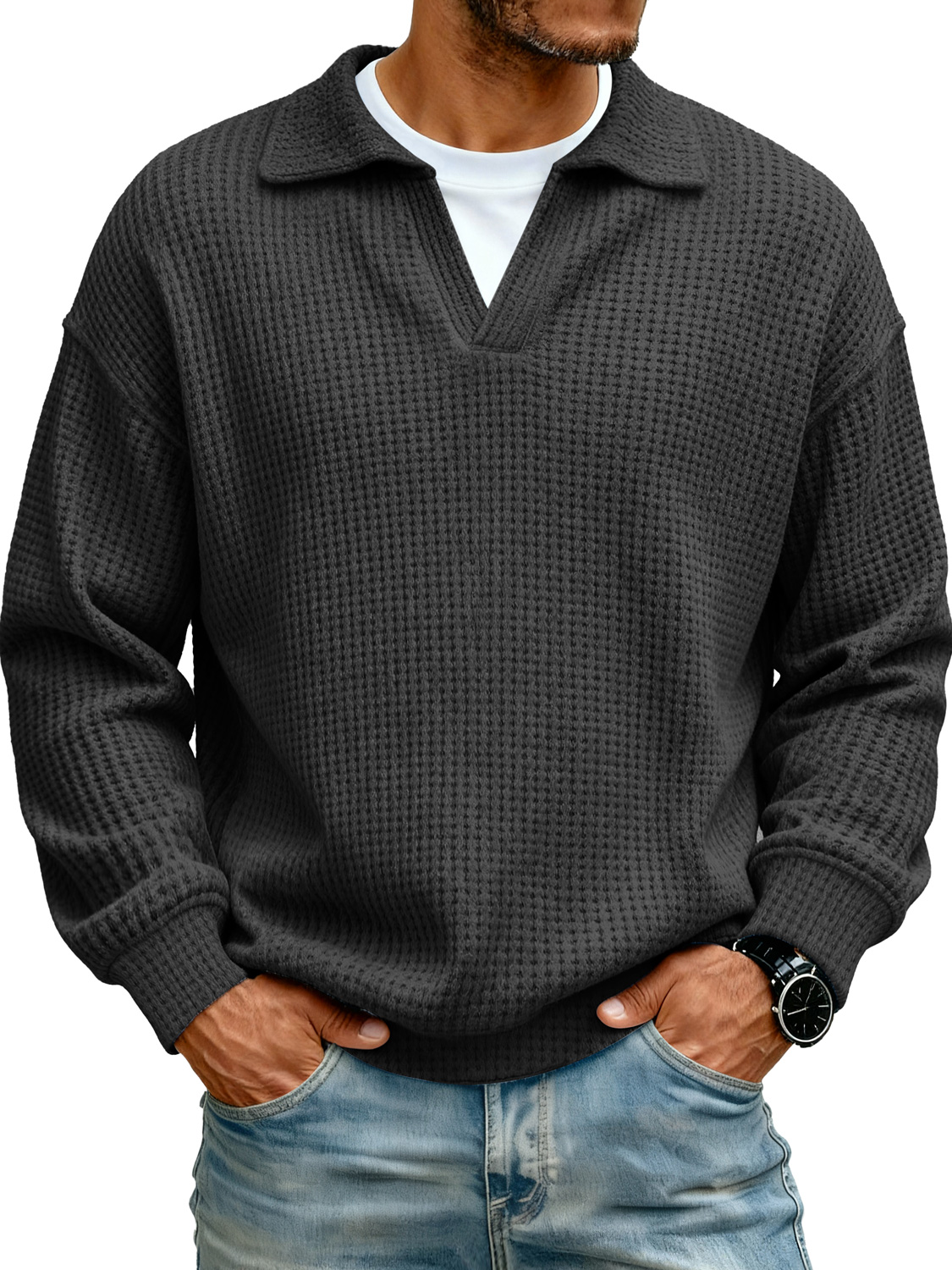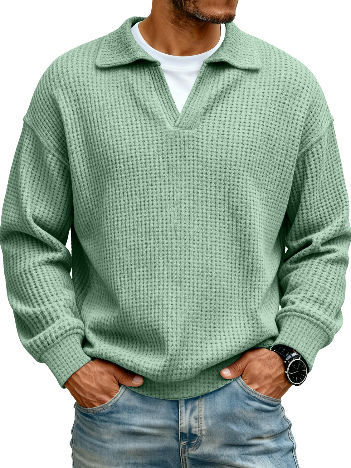 Men's Lapel Faux Two-piece Casual Solid Color Long-sleeved Polo Shirt