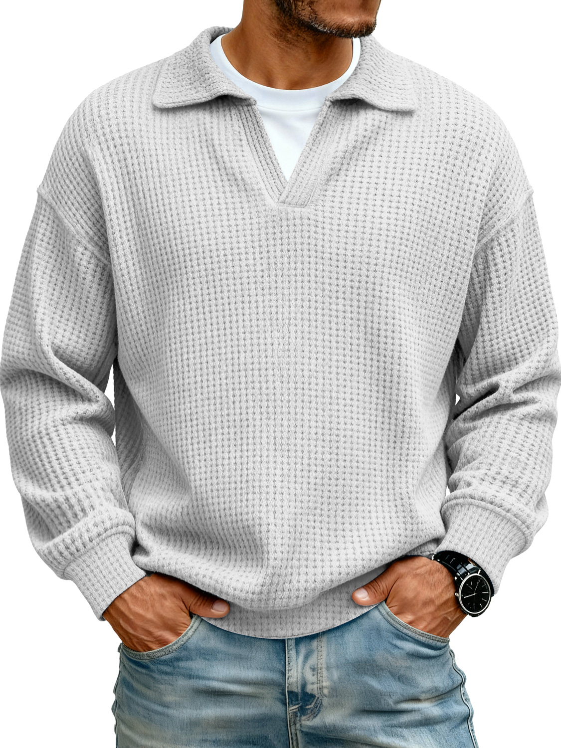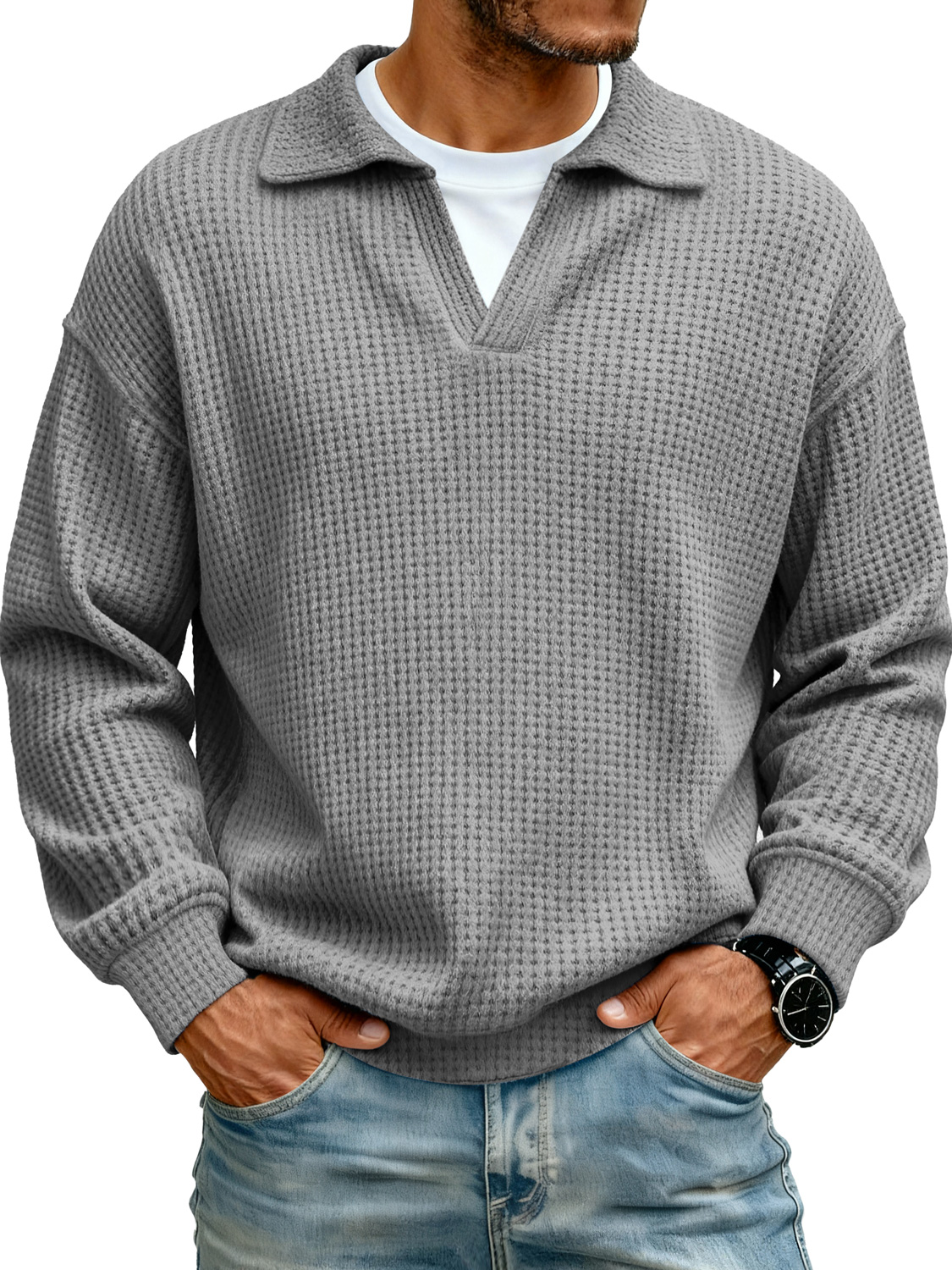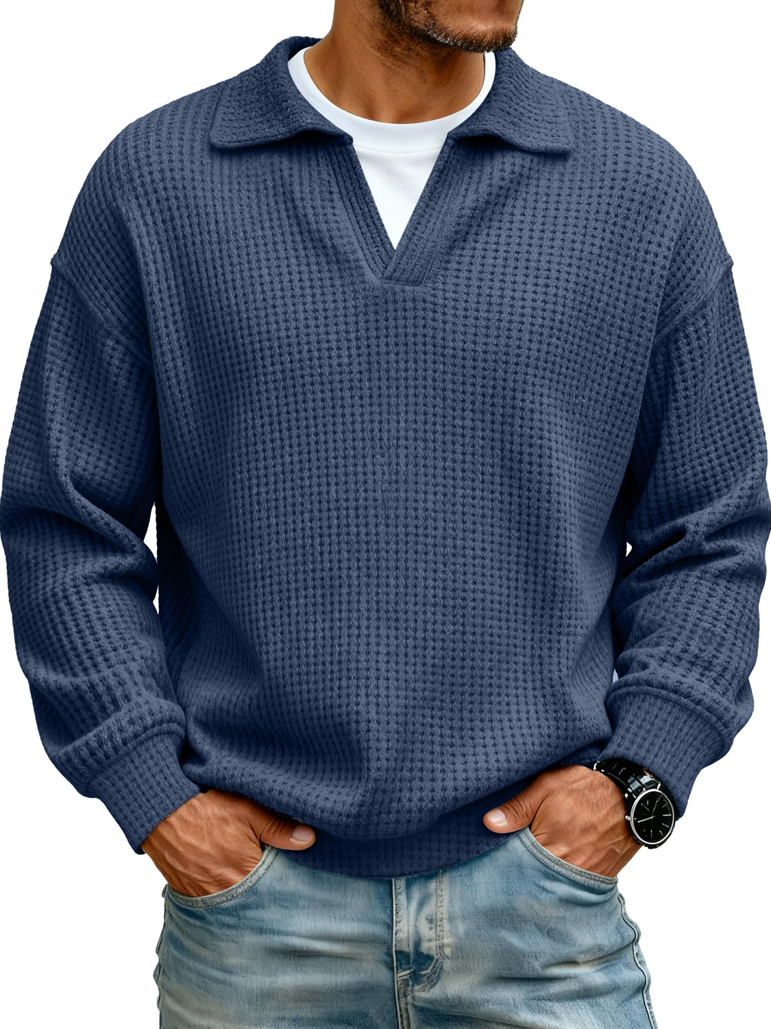 Men's Lapel Faux Two-piece Casual Solid Color Long-sleeved Polo Shirt
